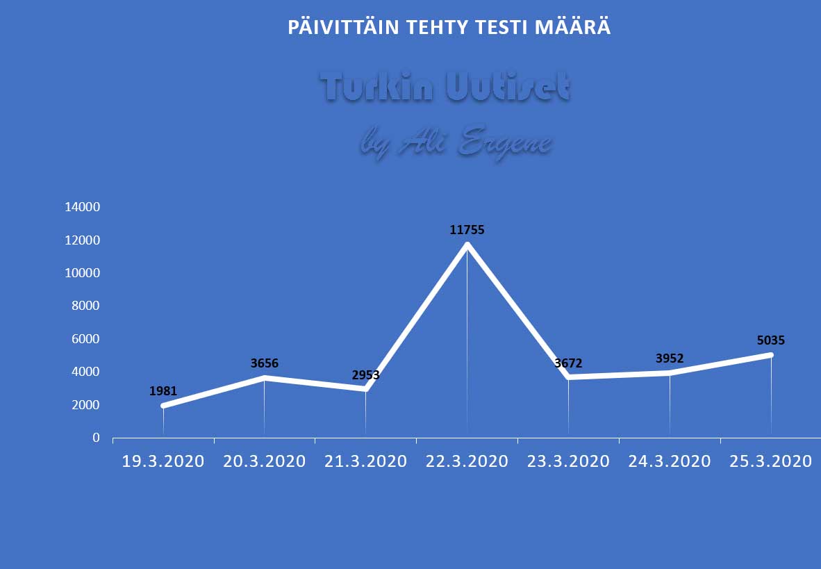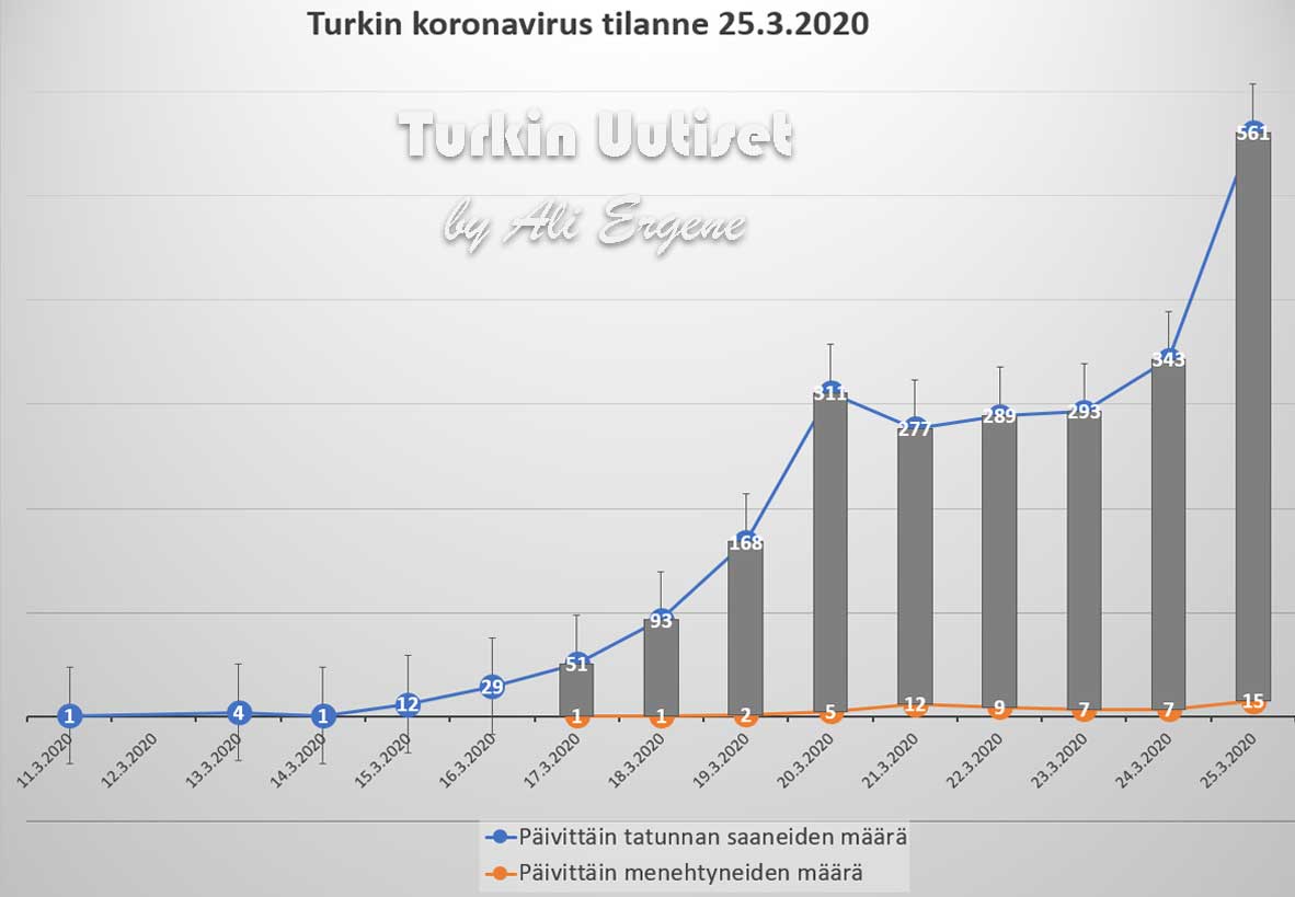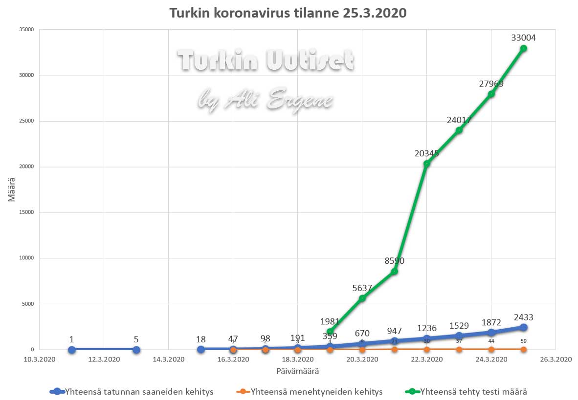 Turkin terveysministeri Fahrettin Kocan mukaan Turkin koronavirus potilaiden määrä on noussut yhteensä 2433. Tänään on todettu lisää 561 tapausta ja 15 henkilö on menehtynyt. Yhteensä menehtyneiden määrä on 59 Kocan mukaan 26 ihmistä on toipunut.