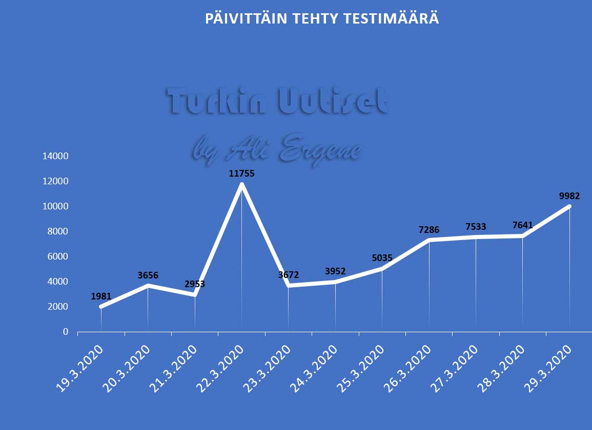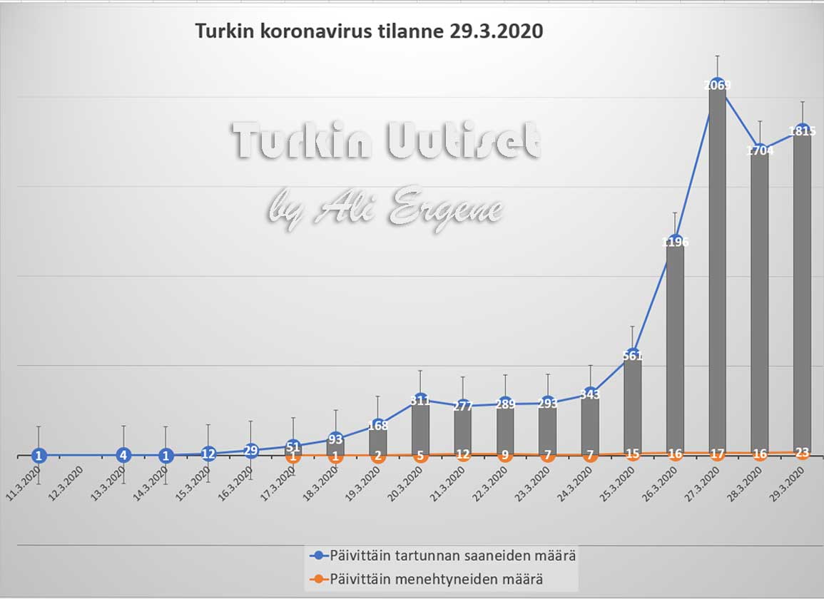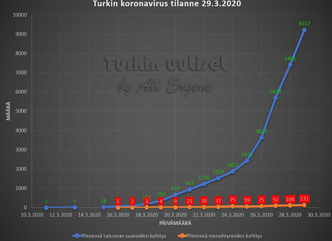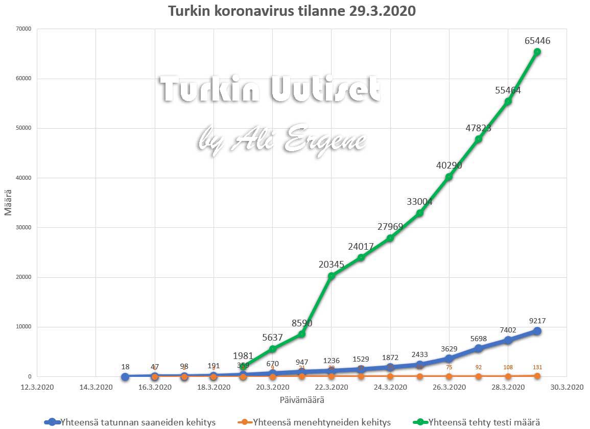 Turkin terveysministeri Fahrettin Koca:n mukaan Turkin koronavirus potilaiden määrä on noussut yhteensä 9217. Tänään on todettu lisää 1815 tapausta ja 23 henkilö on menehtynyt. Yhteensä menehtyneiden määrä on 131. Yhteensä 105 potilasta on kotiutunut sairaaloista toipumisen jälkeen tappavasta viruksesta. Tänään on tehty 9982 testiä.