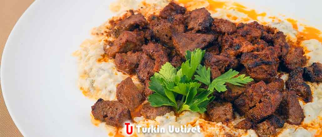 - Laita jogurtti- ja munakoiso seos tarjoilu lautaselle. Kaiva kuoppa lautasen keskiosa ja aseta valmistettu liha sinne.