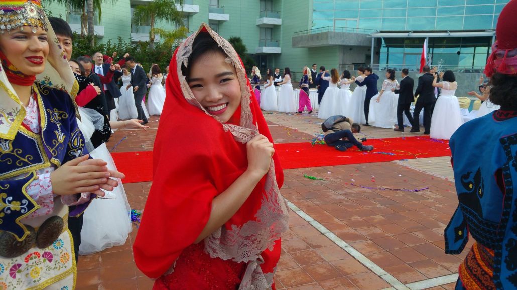Düğünde, tüm çiftler ilk günkü heyecanı yaşama olanağı buldu. Kimisinin çocuklarıyla katıldığı törende, önce Çin gelenekleri yaşatıldı. Birbirilerine bağlılık yemini eden çiftlerin bazıları duygularına hakim olamayarak gözyaşlarına boğuldu. Anne babalarının evlilik yıl dönümü mutluluklarını paylaşan minikler en çok ilgiyi çekti.