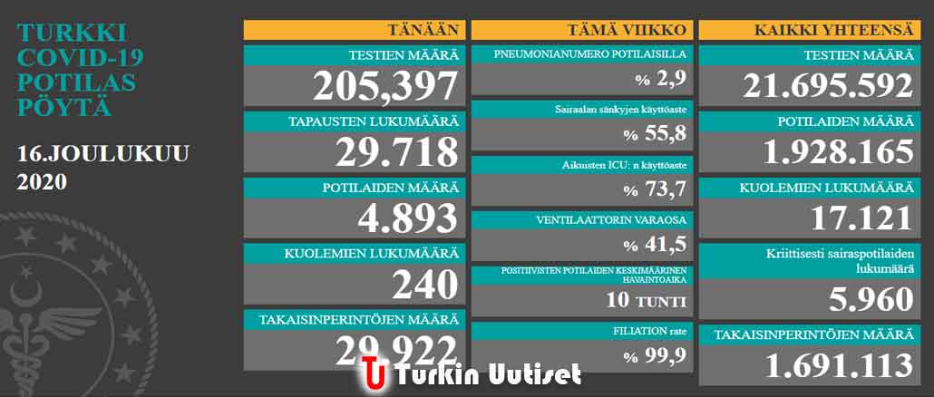 Koronavirus tilanne Turkissa 16.12.2020