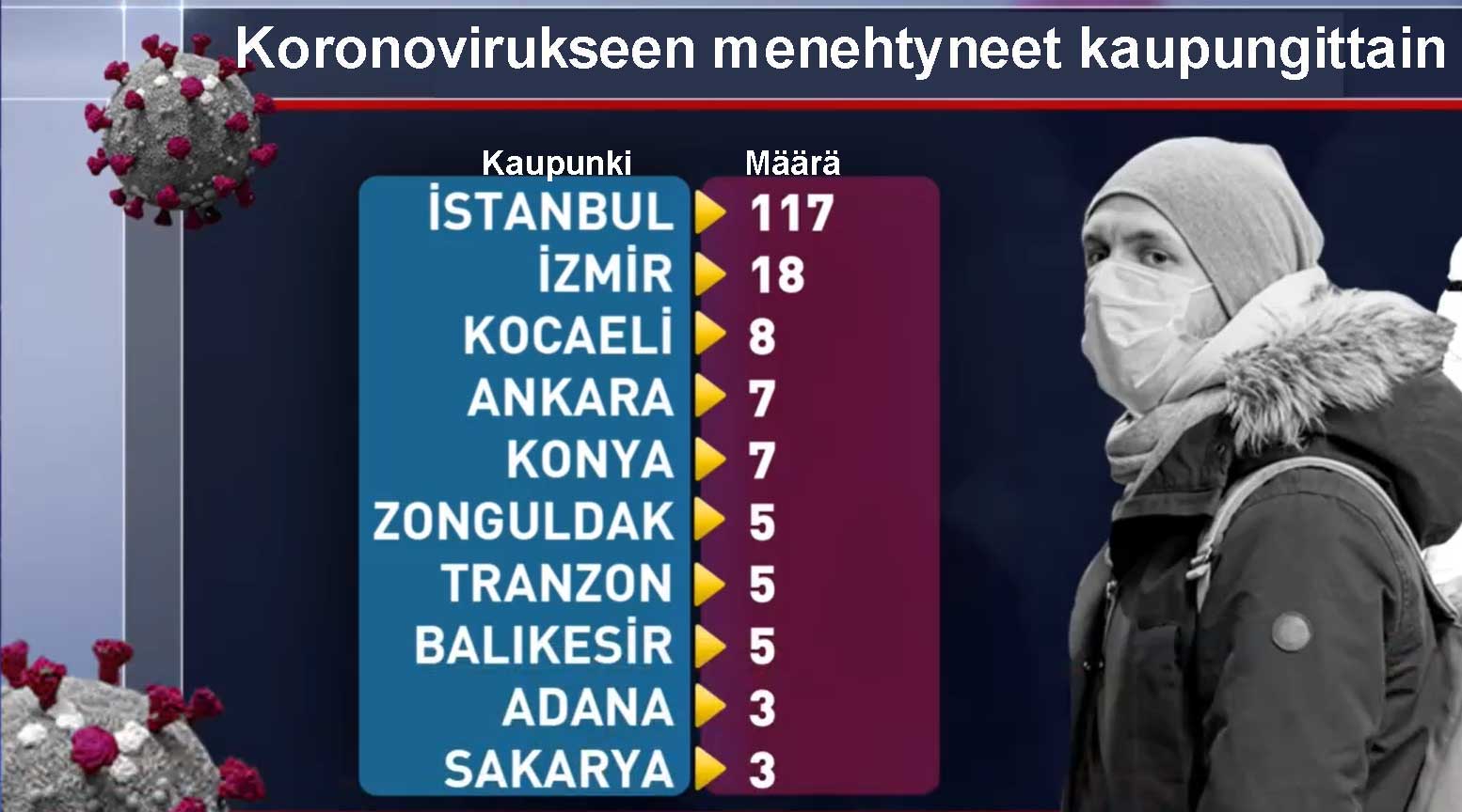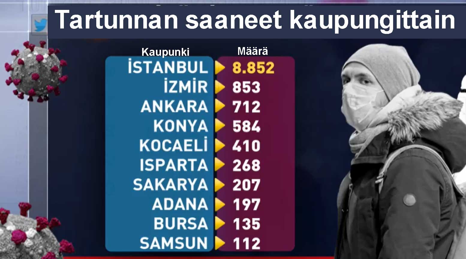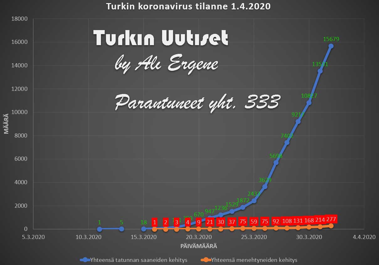 Turkin terveysministeri Fahrettin Koca:n mukaan Turkin koronavirus potilaiden määrä on noussut yhteensä 15679. Tänään on todettu lisää 2148 tapausta ja 63 henkilöä on menehtynyt. Yhteensä menehtyneiden määrä on 277. Yhteensä 333 potilasta on kotiutunut sairaaloista toipumisen jälkeen tappavasta viruksesta. Tänään on tehty 14396 testiä. Fahrettin Koca sanoi myös korononavirukseen menehtyneiden ja tartunnan saaneiden kaupungit ja määrät.