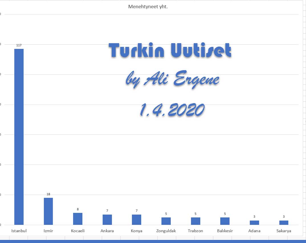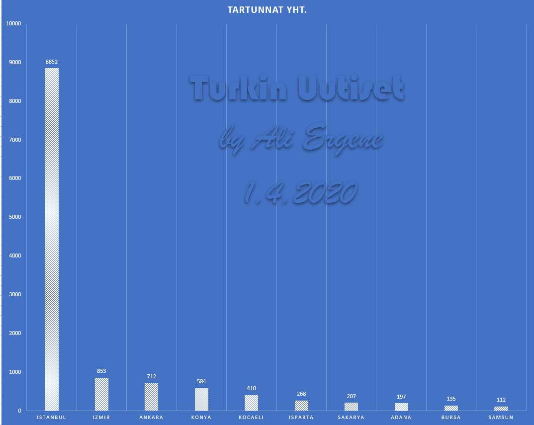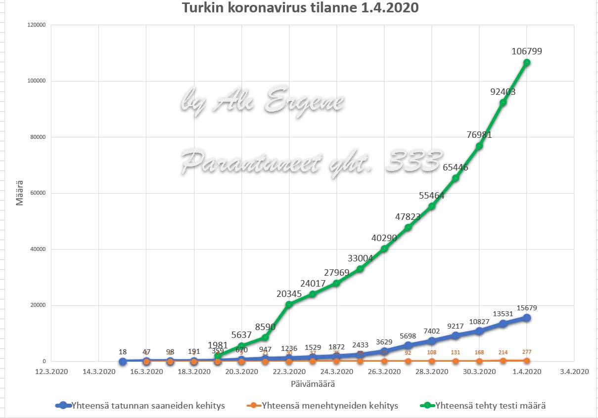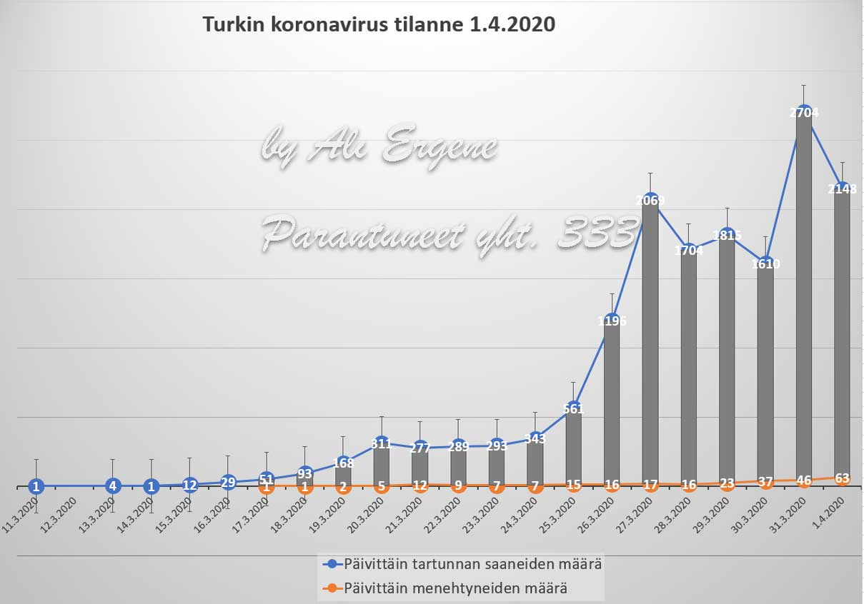 Turkin terveysministeri Fahrettin Koca:n mukaan Turkin koronavirus potilaiden määrä on noussut yhteensä 15679. Tänään on todettu lisää 2148 tapausta ja 63 henkilöä on menehtynyt. Yhteensä menehtyneiden määrä on 277. Yhteensä 333 potilasta on kotiutunut sairaaloista toipumisen jälkeen tappavasta viruksesta. Tänään on tehty 14396 testiä. Fahrettin Koca sanoi myös korononavirukseen menehtyneiden ja tartunnan saaneiden kaupungit ja määrät.