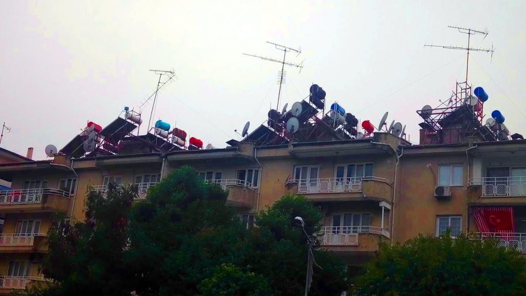 Monet suomalaiset kaverit ja turistit ovat kysyneet minulta monta kertaa Turkin asuntojen katolla sijaitsevista laitteista. ”Mitä nuo ovat? Niihin törmää täällä joka paikassa.” Ihmettelin kysymystä. Koska minä aina olen luullut että niitä käytetään joka puolella maailmaa. Koska se on ilmaisella energialla lämmitettyä vettä. Eli auringosta ja sitä löytyy joka puolelta Turkkia.