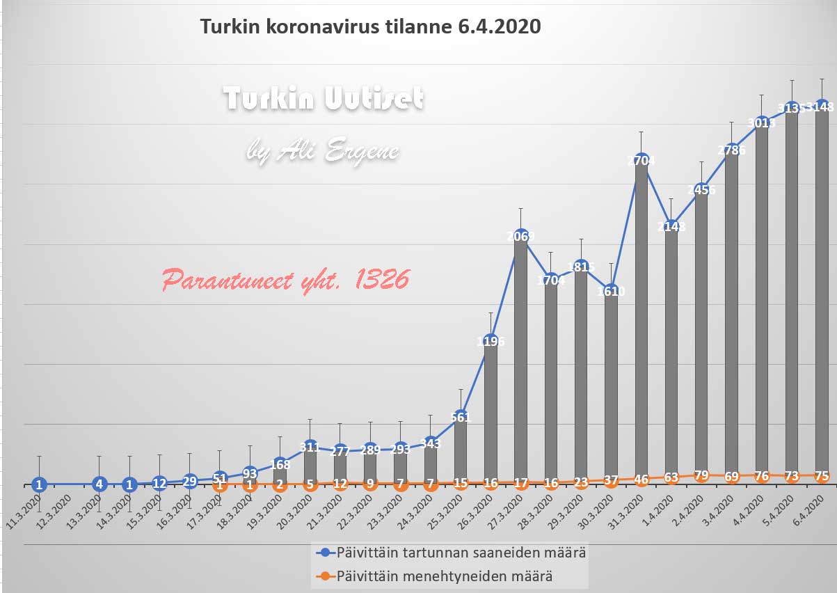 Turkin terveysministeriön mukaan Turkin koronavirus potilaiden määrä on noussut yhteensä 30217. Tänään on todettu lisää 3148 tapausta ja 75 henkilöä on menehtynyt. Yhteensä menehtyneiden määrä on 649. Yhteensä 1326 potilasta on kotiutunut sairaaloista toipumisen jälkeen tappavasta viruksesta. Tänään on tehty 21400 testiä. Ensimmäisen kerran päivittäiset testiluvut ovat ylittäneet 21000. Mutta tartunnan saaneiden määrä pysyy vakaasti. Asiantuntijoidan mukaan tämä on hyvä merkki. Suojamaskeja ei voi enää myydä maksullisena Turkissa. Valtio ja kunnat jakaavat maskeja kansalle ilmaiseksi.