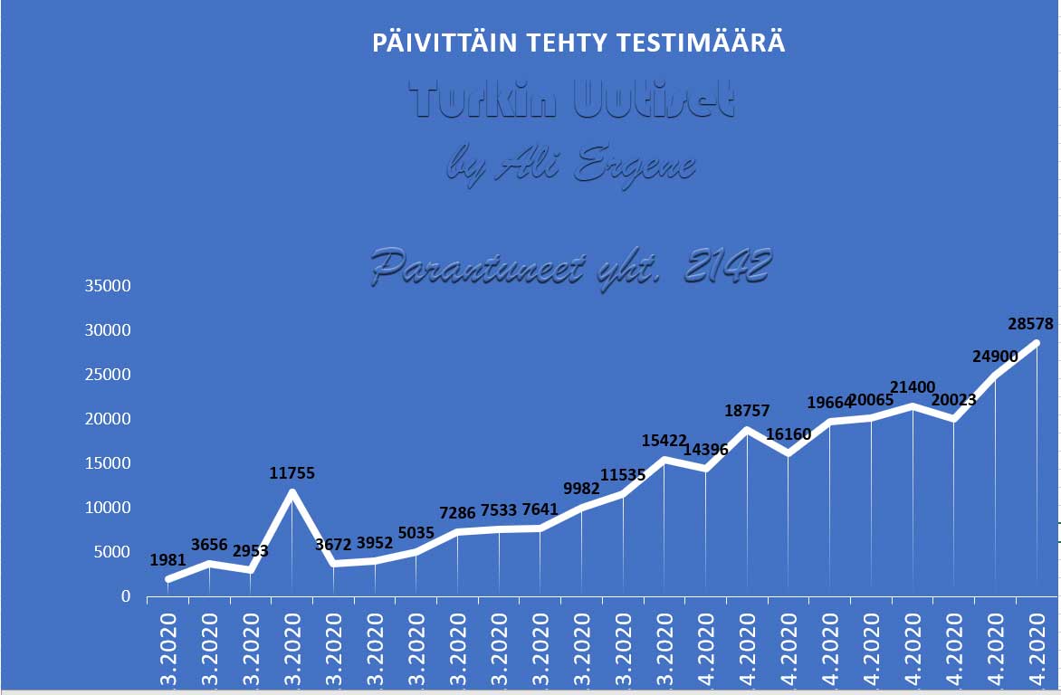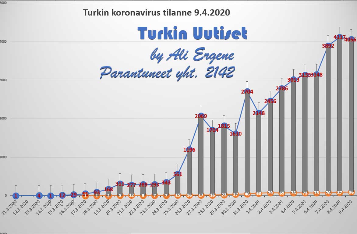 Turkin terveysministeriön mukaan Turkin koronavirus potilaiden määrä on noussut yhteensä 42282. Tänään on todettu lisää 4056 tapausta ja 96 henkilöä on menehtynyt. Yhteensä menehtyneiden määrä on 908. Yhteensä 2142 potilasta on kotiutunut sairaaloista toipumisen jälkeen tappavasta viruksesta. Tänään on tehty 28578 testiä.