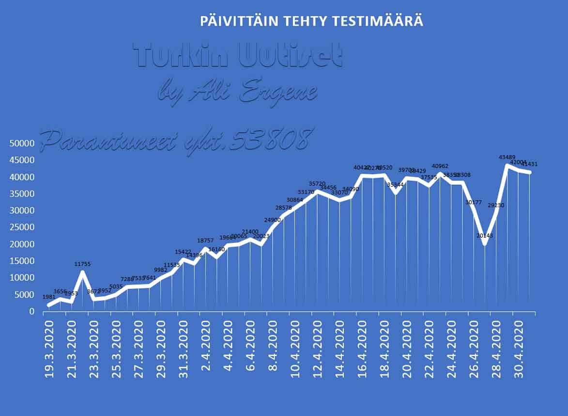 Turkin terveysministeri Fahrettin Koca mukaan Turkin koronavirus potilaiden määrä on noussut yhteensä 122392. Tänään on todettu lisää 2188 tapausta ja 84 henkilöä on menehtynyt. Yhteensä menehtyneiden määrä on 3258. Yhteensä 53808 potilasta on kotiutunut sairaaloista toipumisen jälkeen tappavasta viruksesta. Tänään on tehty 42004 testiä.