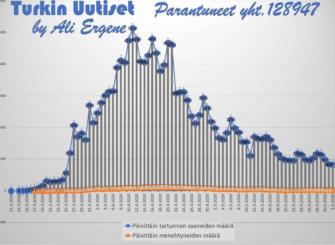 Turkin terveysministeri Fahrettin Koca mukaan Turkin koronavirus potilaiden määrä on noussut yhteensä 164769. Tänään on todettu lisää 827 tapausta ja 23 henkilöä on menehtynyt. Yhteensä menehtyneiden määrä on 4563. Yhteensä 128947 potilasta on kotiutunut sairaaloista toipumisen jälkeen tappavasta viruksesta. Tänään on tehty 31525 testiä.