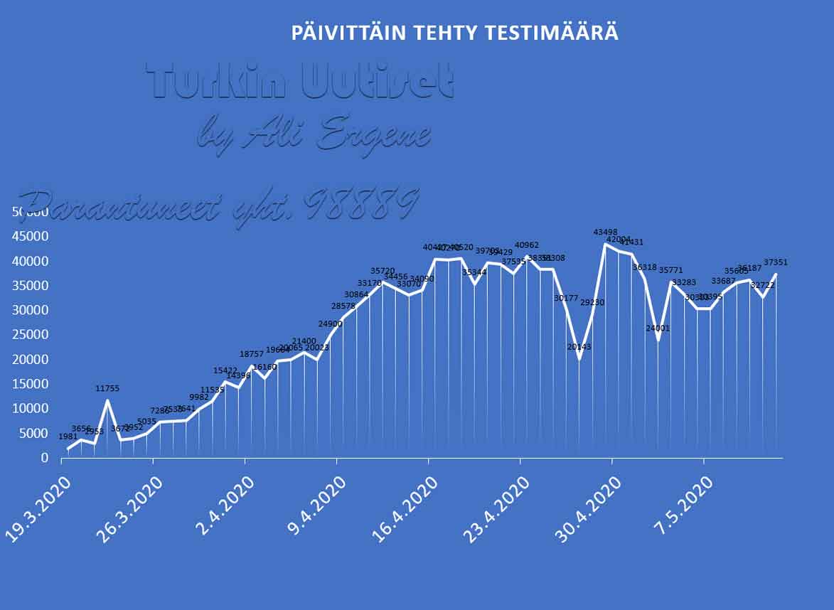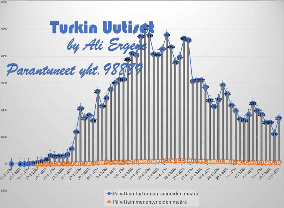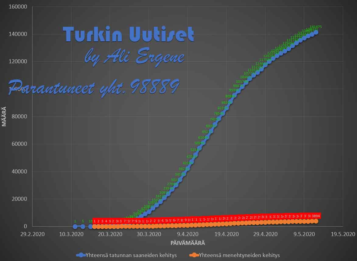 Turkin terveysministeri Fahrettin Koca mukaan Turkin koronavirus potilaiden määrä on noussut yhteensä 141475. Tänään on todettu lisää 1704 tapausta ja 53 henkilöä on menehtynyt. Yhteensä menehtyneiden määrä on 3894. Yhteensä 98889 potilasta on kotiutunut sairaaloista toipumisen jälkeen tappavasta viruksesta. Tänään on tehty 37351 testiä.