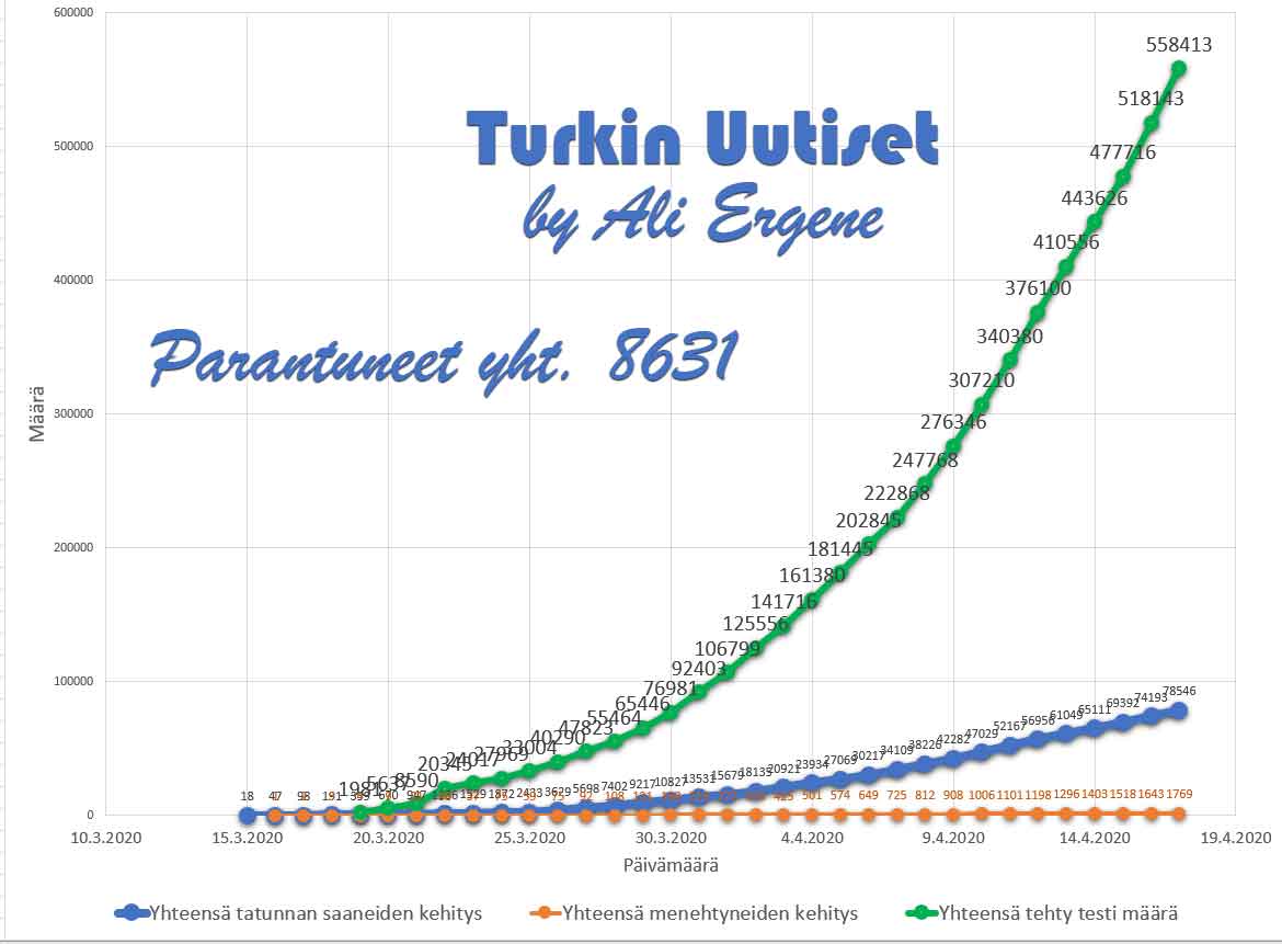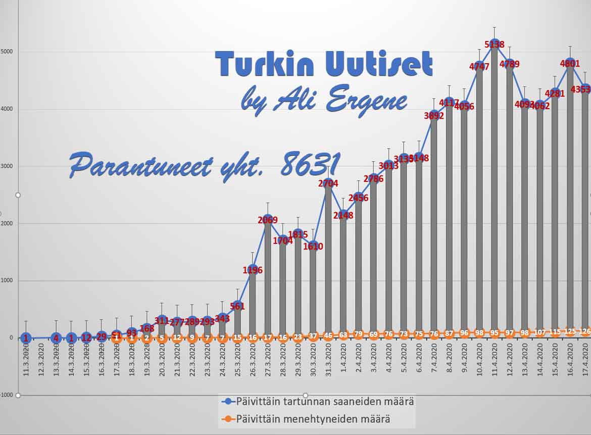 Turkin terveysministeri Fahrettin Koca mukaan Turkin koronavirus potilaiden määrä on noussut yhteensä 78546. Tänään on todettu lisää 4353 tapausta ja 126 henkilöä on menehtynyt. Yhteensä menehtyneiden määrä on 1769. Yhteensä 8631 potilasta on kotiutunut sairaaloista toipumisen jälkeen tappavasta viruksesta. Tänään on tehty 40270 testiä.