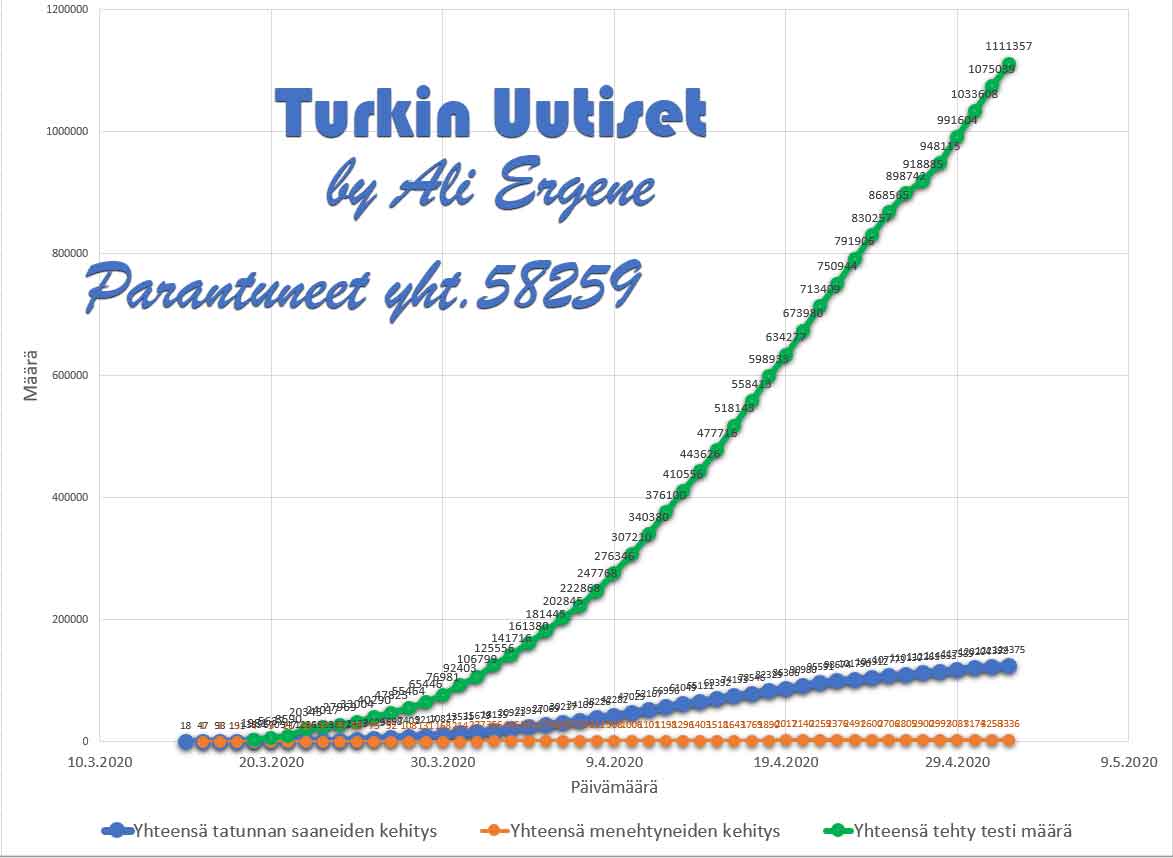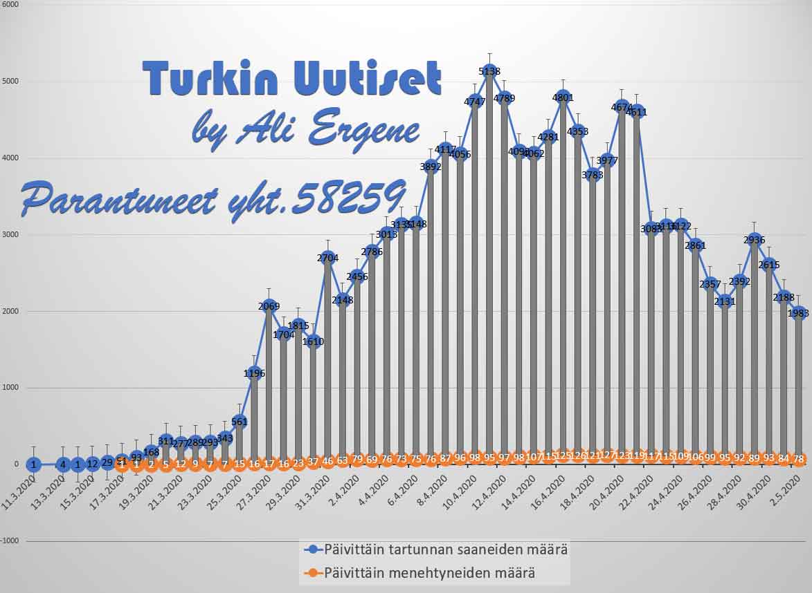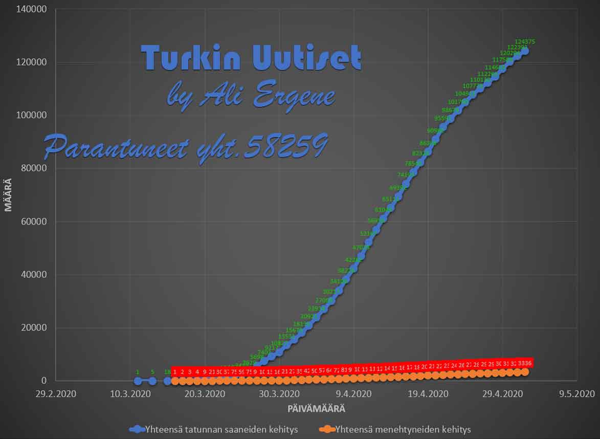 Turkin terveysministeri Fahrettin Koca mukaan Turkin koronavirus potilaiden määrä on noussut yhteensä 124375. Tänään on todettu lisää 1983 tapausta ja 78 henkilöä on menehtynyt. Yhteensä menehtyneiden määrä on 3336. Yhteensä 58259 potilasta on kotiutunut sairaaloista toipumisen jälkeen tappavasta viruksesta. Tänään on tehty 36318 testiä.