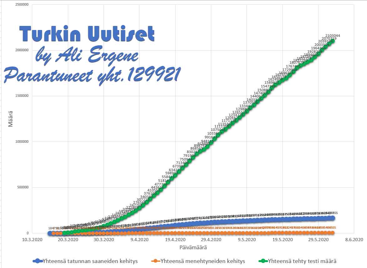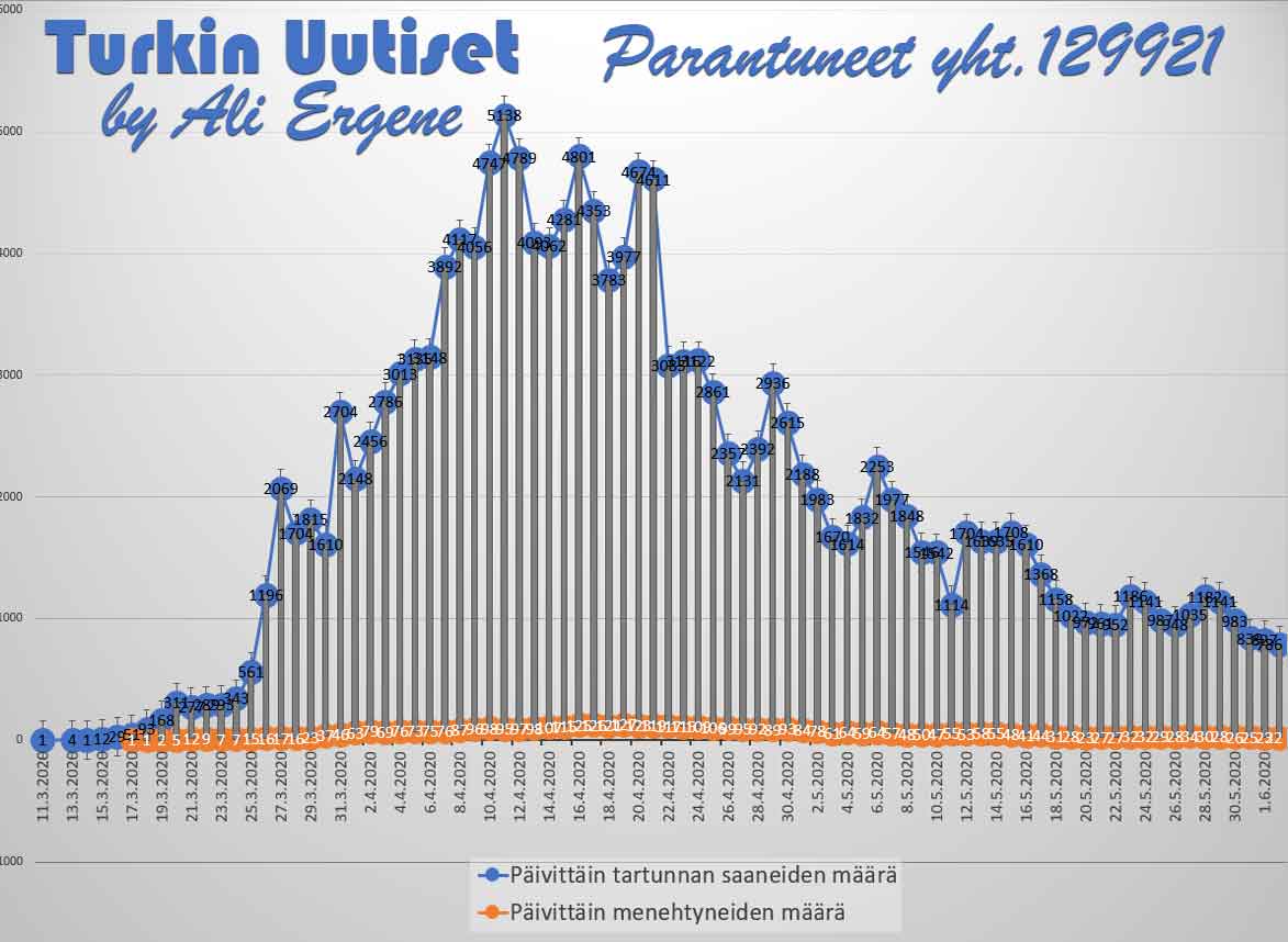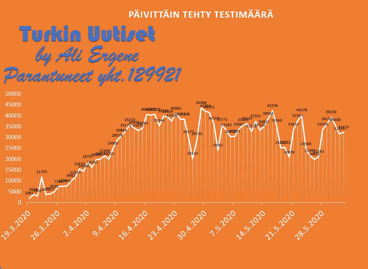 Turkin terveysministeri Fahrettin Koca mukaan Turkin koronavirus potilaiden määrä on noussut yhteensä 165555. Tänään on todettu lisää 786 tapausta ja 22 henkilöä on menehtynyt. Yhteensä menehtyneiden määrä on 4585. Yhteensä 129921 potilasta on kotiutunut sairaaloista toipumisen jälkeen tappavasta viruksesta. Tänään on tehty 32325 testiä.