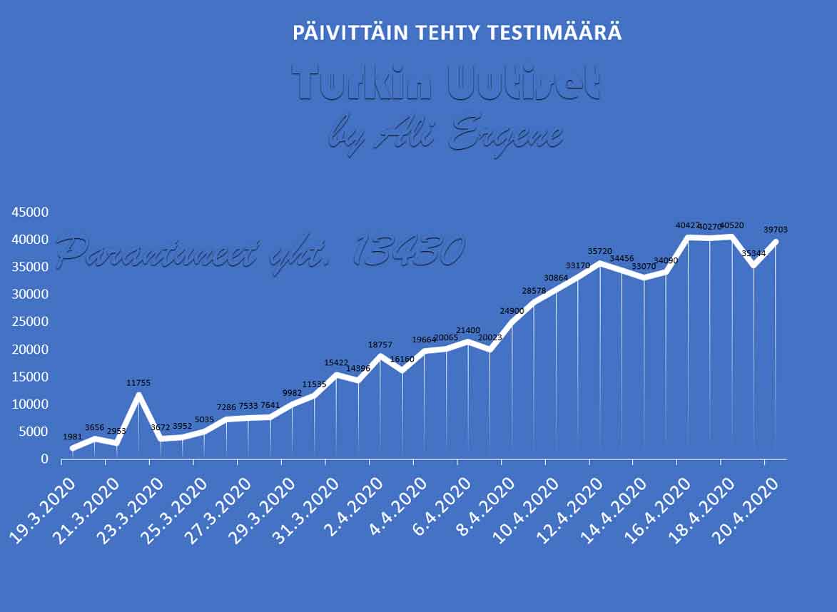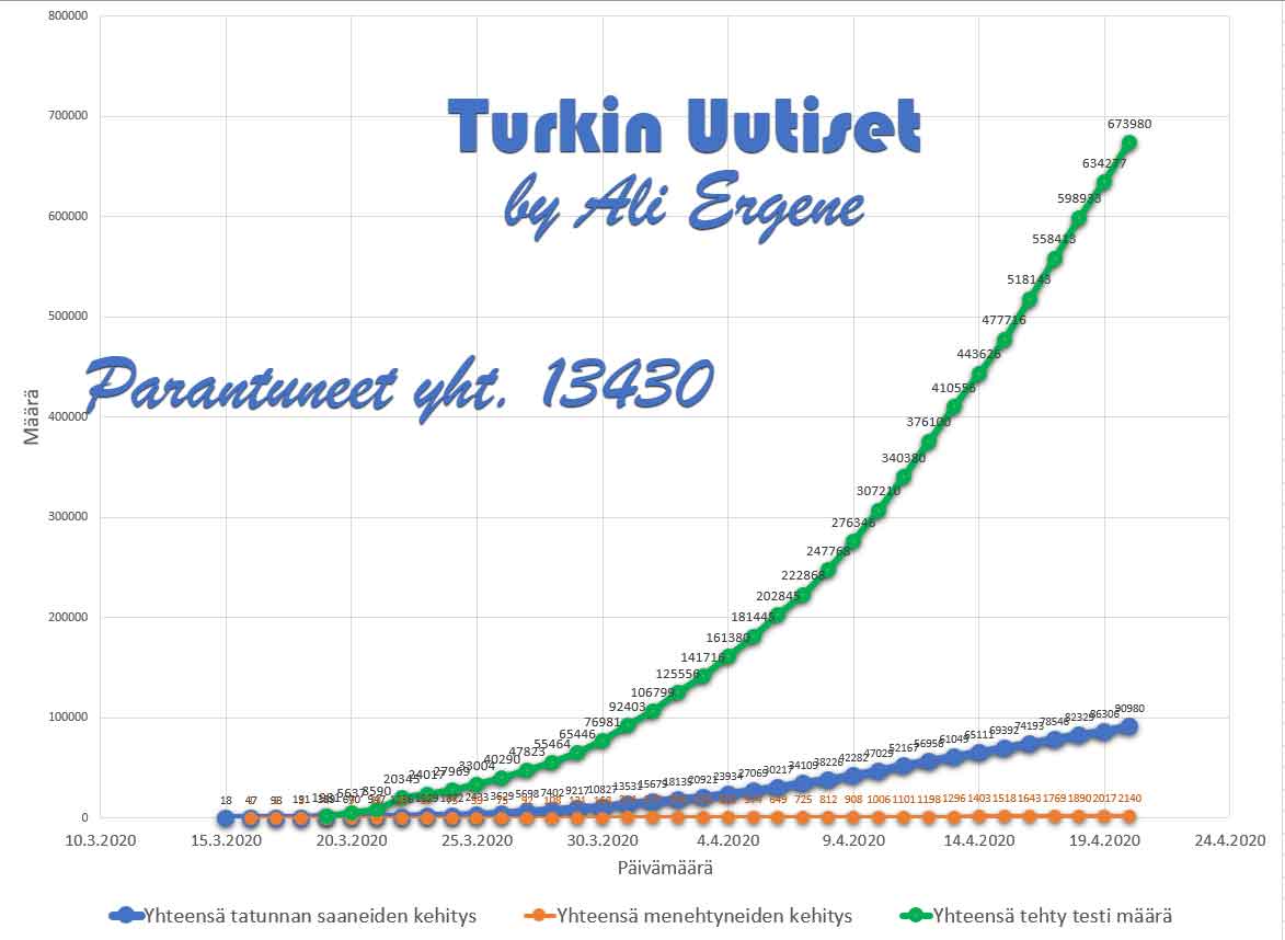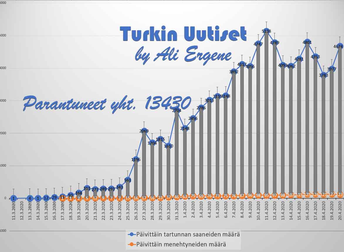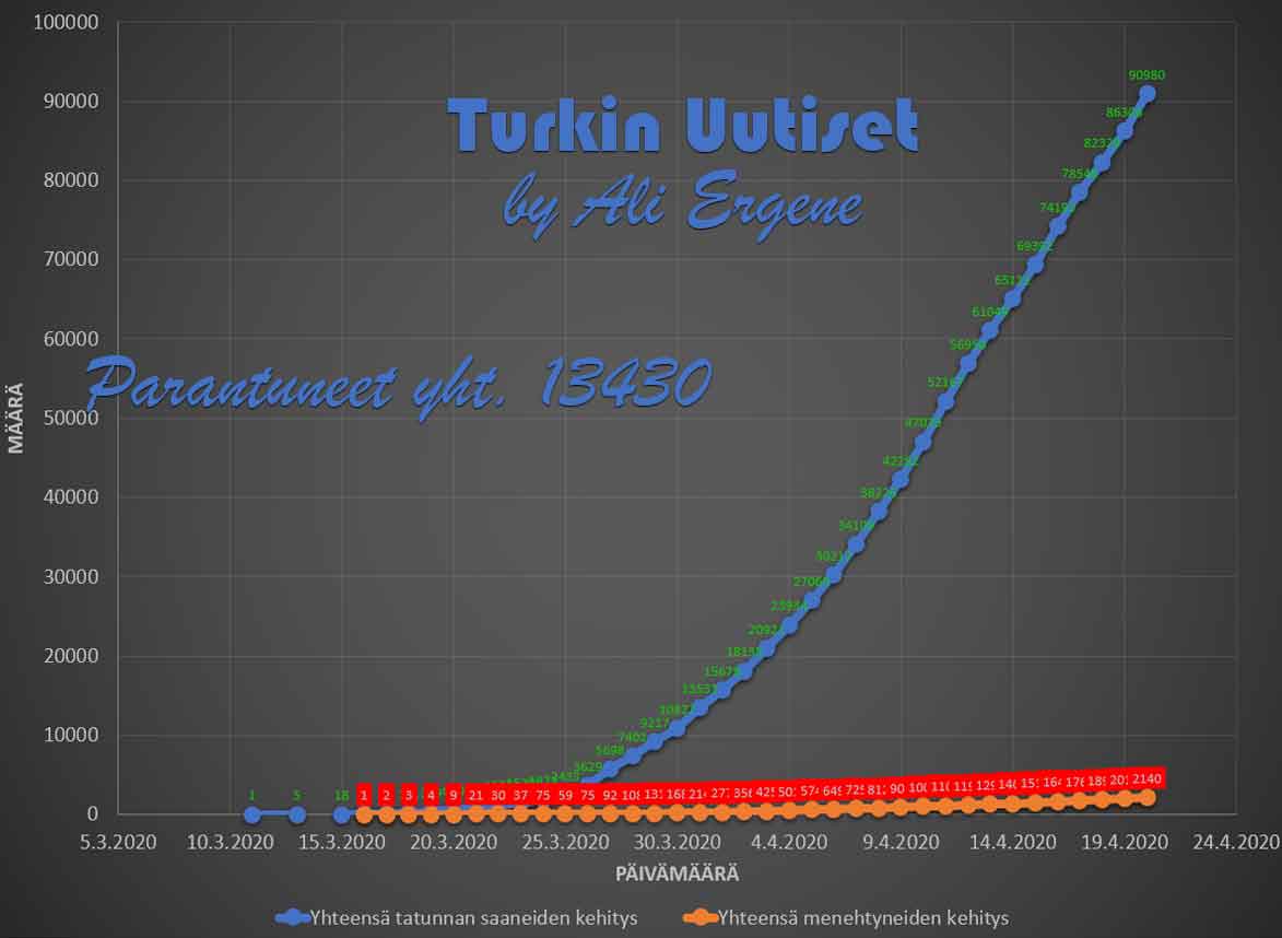 Turkin terveysministeri Fahrettin Koca mukaan Turkin koronavirus potilaiden määrä on noussut yhteensä 90980. Tänään on todettu lisää 4674 tapausta ja 123 henkilöä on menehtynyt. Yhteensä menehtyneiden määrä on 2140. Yhteensä 13430 potilasta on kotiutunut sairaaloista toipumisen jälkeen tappavasta viruksesta. Tänään on tehty 39703 testiä.