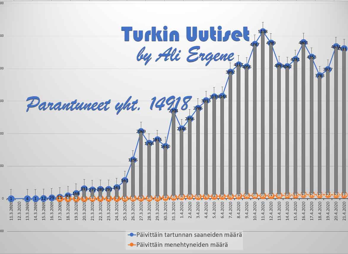 Turkin terveysministeri Fahrettin Koca mukaan Turkin koronavirus potilaiden määrä on noussut yhteensä 95591. Tänään on todettu lisää 4611 tapausta ja 119 henkilöä on menehtynyt. Yhteensä menehtyneiden määrä on 2259. Yhteensä 14918 potilasta on kotiutunut sairaaloista toipumisen jälkeen tappavasta viruksesta. Tänään on tehty 39429 testiä.