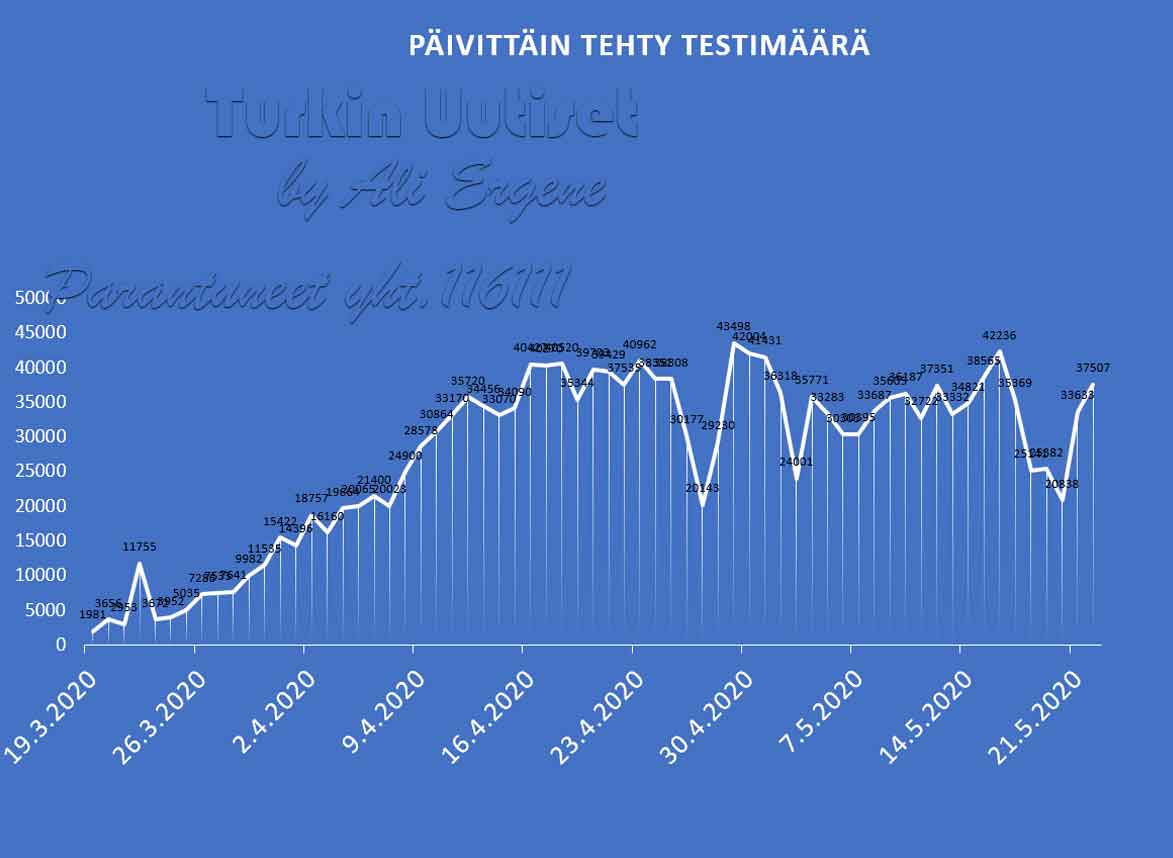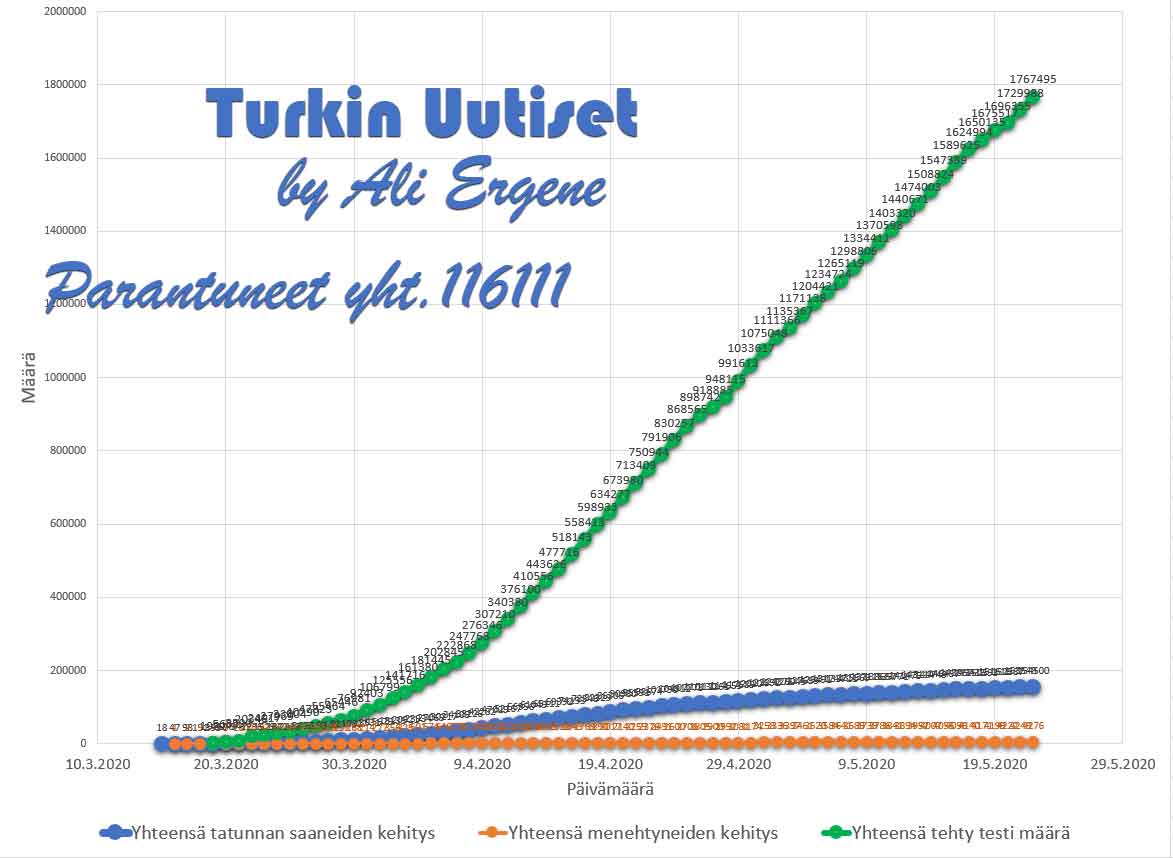 Turkin terveysministeri Fahrettin Koca mukaan Turkin koronavirus potilaiden määrä on noussut yhteensä 154500. Tänään on todettu lisää 952 tapausta ja 27 henkilöä on menehtynyt. Yhteensä menehtyneiden määrä on 4276. Yhteensä 116111 potilasta on kotiutunut sairaaloista toipumisen jälkeen tappavasta viruksesta. Tänään on tehty 37507 testiä.