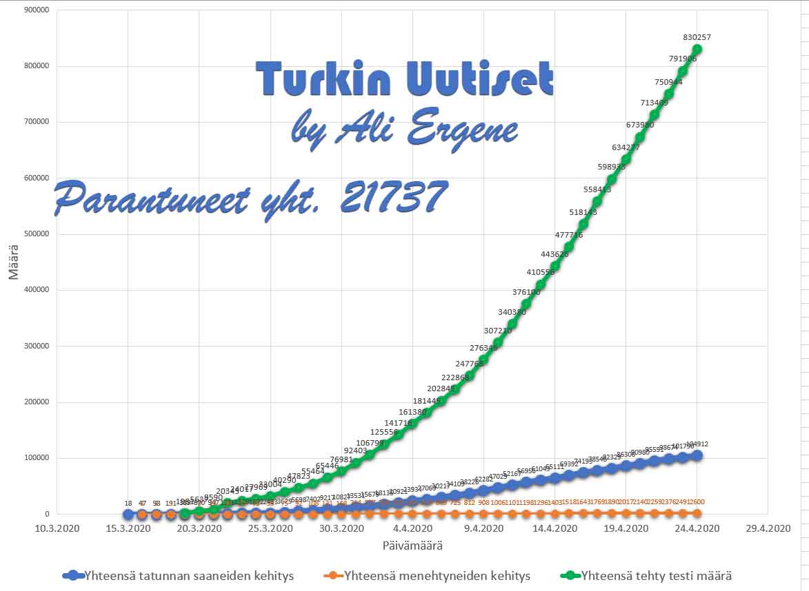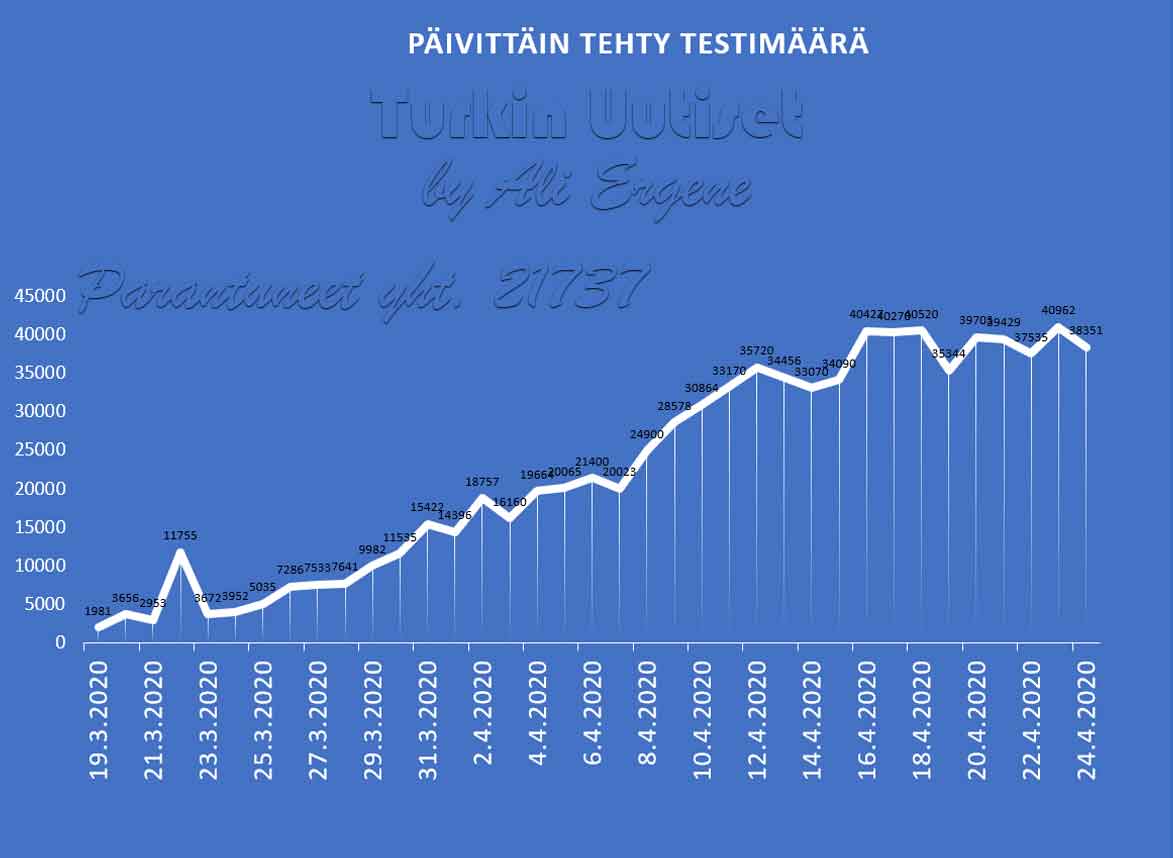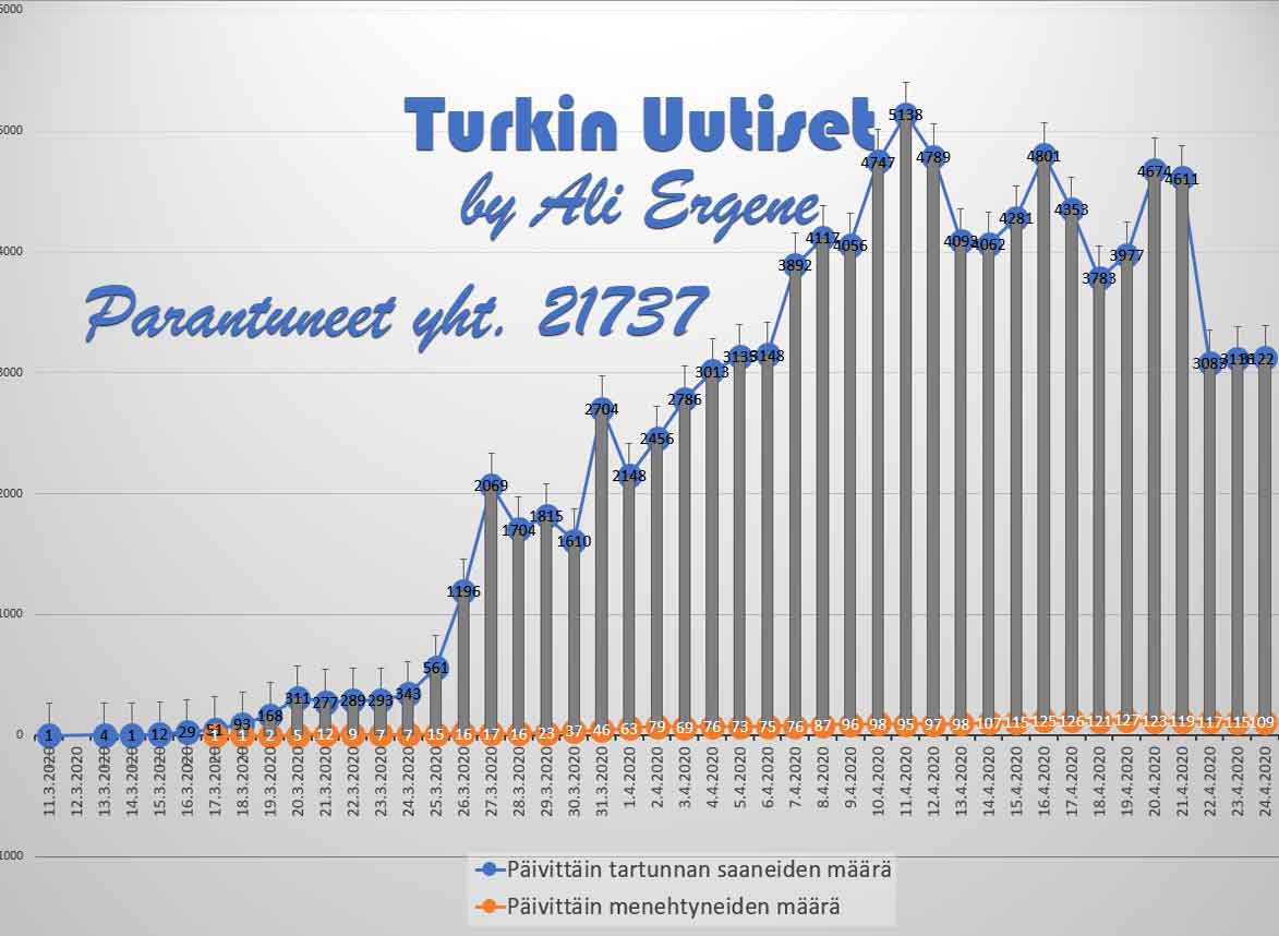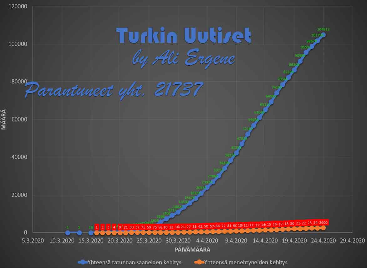 Turkin terveysministeri Fahrettin Koca mukaan Turkin koronavirus potilaiden määrä on noussut yhteensä 104912. Tänään on todettu lisää 3122 tapausta ja 109 henkilöä on menehtynyt. Yhteensä menehtyneiden määrä on 2600. Yhteensä 21737 potilasta on kotiutunut sairaaloista toipumisen jälkeen tappavasta viruksesta. Tänään on tehty 38351 testiä.