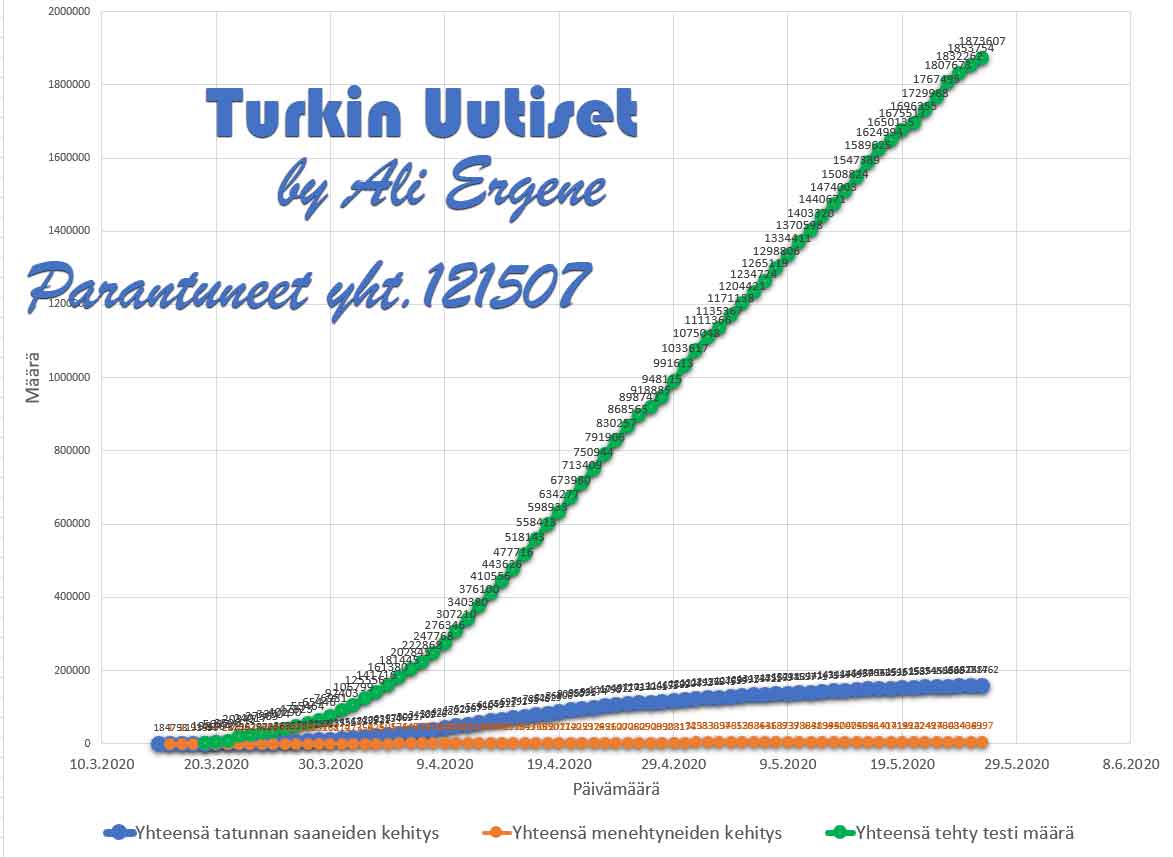 Turkin terveysministeri Fahrettin Koca mukaan Turkin koronavirus potilaiden määrä on noussut yhteensä 158762. Tänään on todettu lisää 948 tapausta ja 28 henkilöä on menehtynyt. Yhteensä menehtyneiden määrä on 4397. Yhteensä 121507 potilasta on kotiutunut sairaaloista toipumisen jälkeen tappavasta viruksesta. Tänään on tehty 19853 testiä.