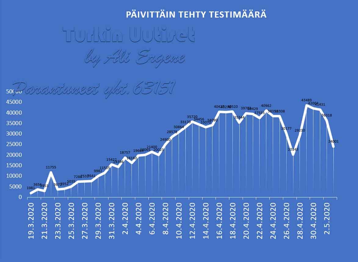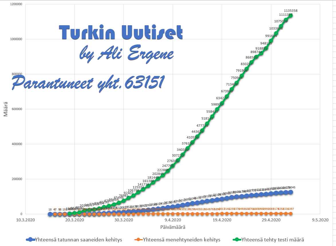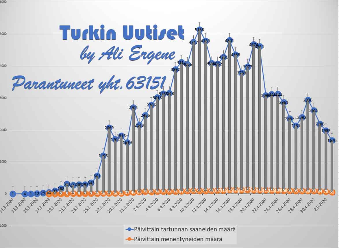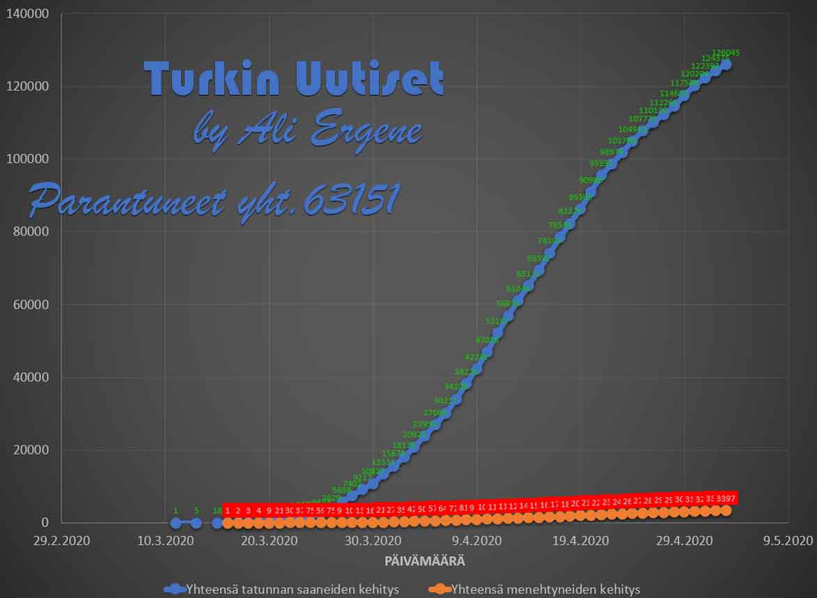 Turkin terveysministeri Fahrettin Koca mukaan Turkin koronavirus potilaiden määrä on noussut yhteensä 126045. Tänään on todettu lisää 1670 tapausta ja 61 henkilöä on menehtynyt. Yhteensä menehtyneiden määrä on 3397. Yhteensä 63151 potilasta on kotiutunut sairaaloista toipumisen jälkeen tappavasta viruksesta. Tänään on tehty 24001 testiä.