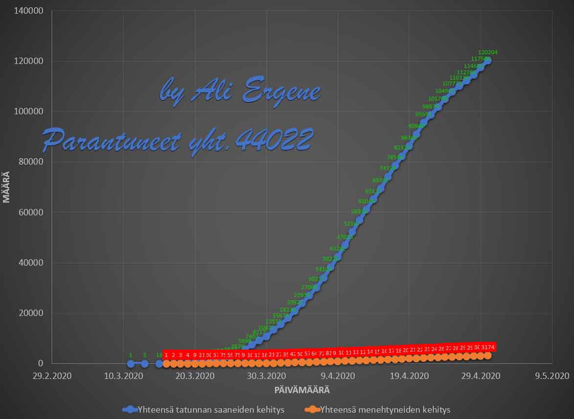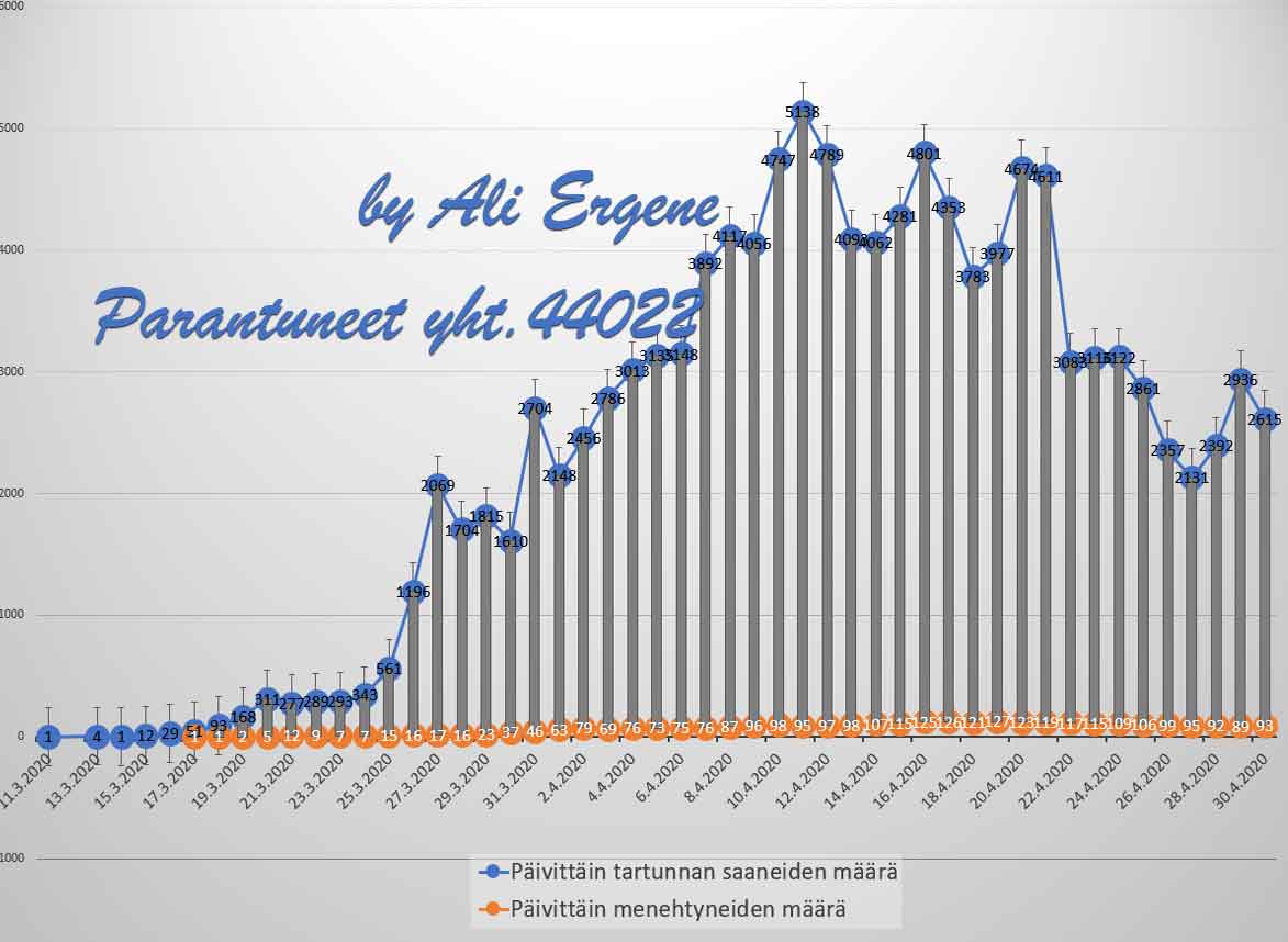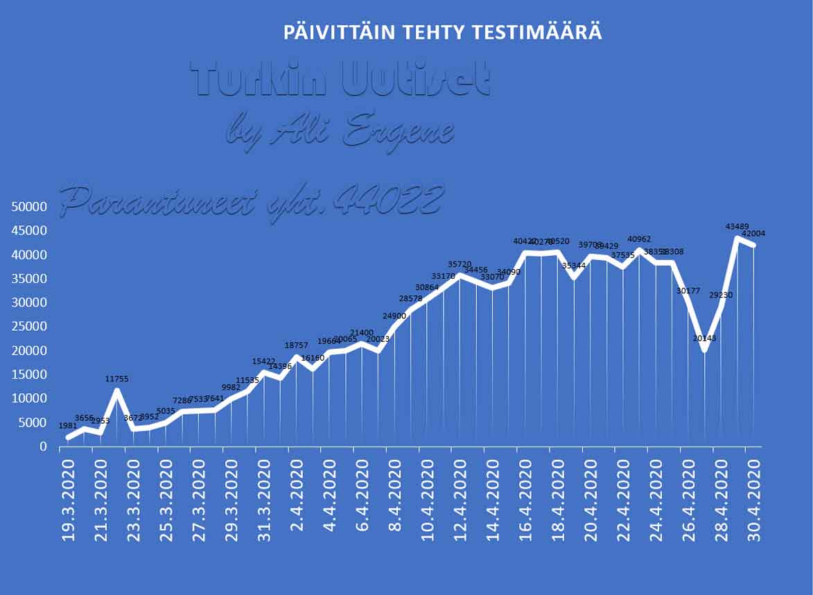 Turkin terveysministeri Fahrettin Koca mukaan Turkin koronavirus potilaiden määrä on noussut yhteensä 120204. Tänään on todettu lisää 2615 tapausta ja 93 henkilöä on menehtynyt. Yhteensä menehtyneiden määrä on 3174. Yhteensä 48886 potilasta on kotiutunut sairaaloista toipumisen jälkeen tappavasta viruksesta. Tänään on tehty 42004 testiä.