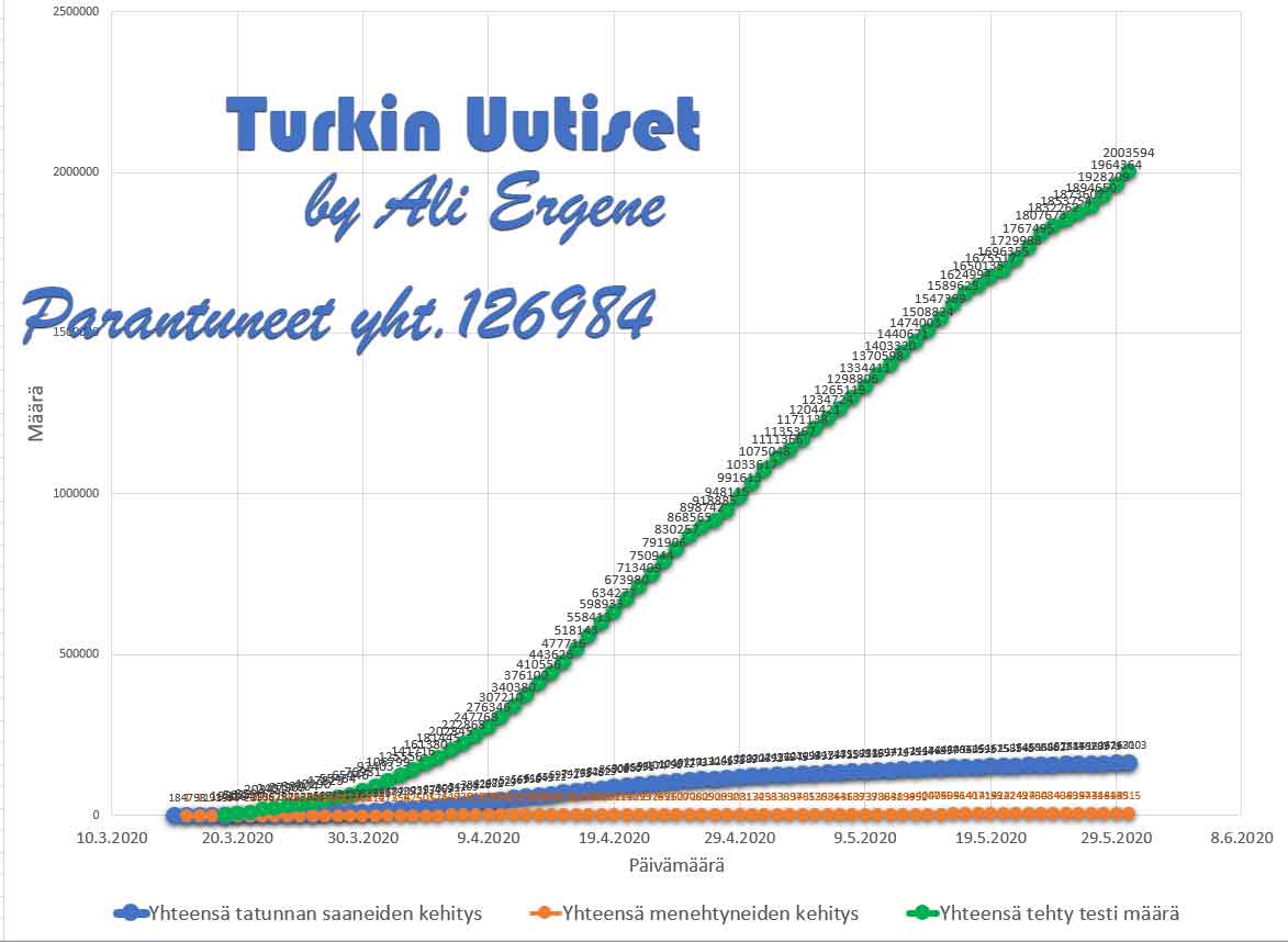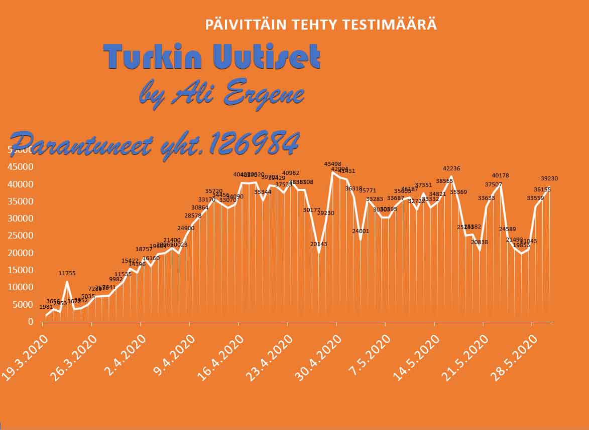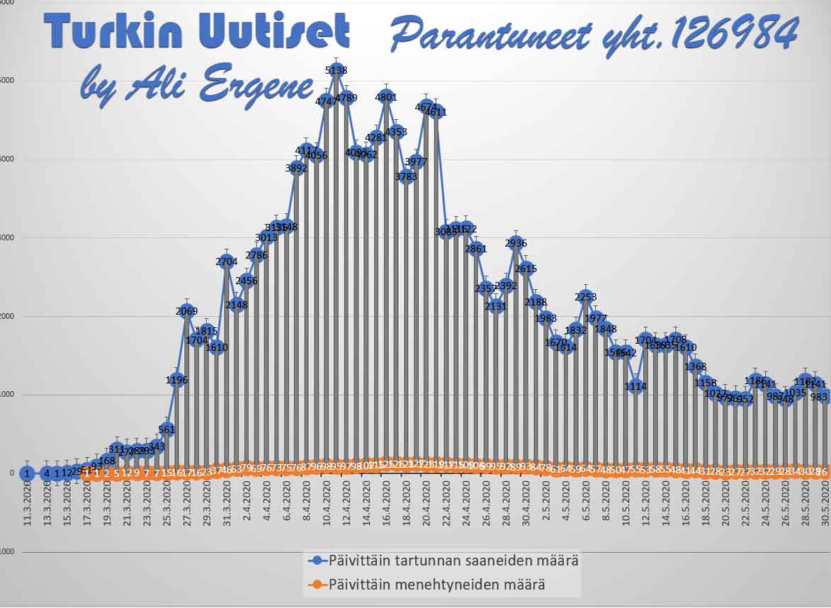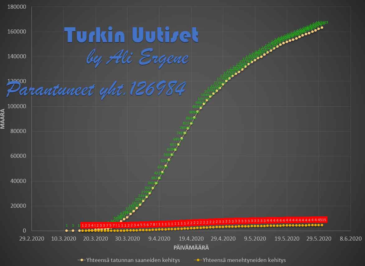 Turkin terveysministeri Fahrettin Koca mukaan Turkin koronavirus potilaiden määrä on noussut yhteensä 163103. Tänään on todettu lisää 983 tapausta ja 26 henkilöä on menehtynyt. Yhteensä menehtyneiden määrä on 4515. Yhteensä 126984 potilasta on kotiutunut sairaaloista toipumisen jälkeen tappavasta viruksesta. Tänään on tehty 39230 testiä.