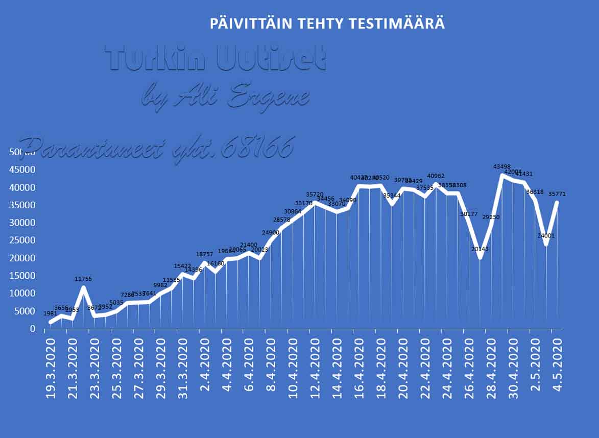 Turkin terveysministeri Fahrettin Koca mukaan Turkin koronavirus potilaiden määrä on noussut yhteensä 127659. Tänään on todettu lisää 1614 tapausta ja 64 henkilöä on menehtynyt. Yhteensä menehtyneiden määrä on 3461. Yhteensä 68166 potilasta on kotiutunut sairaaloista toipumisen jälkeen tappavasta viruksesta. Tänään on tehty 35771 testiä.