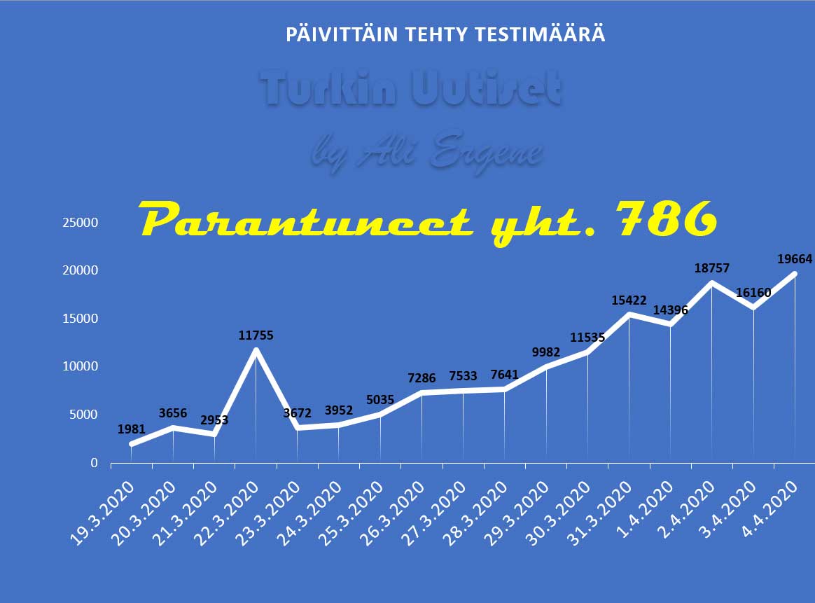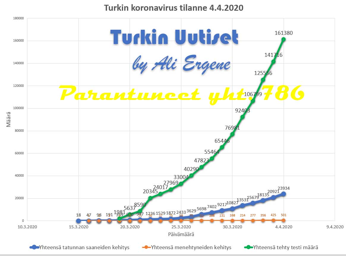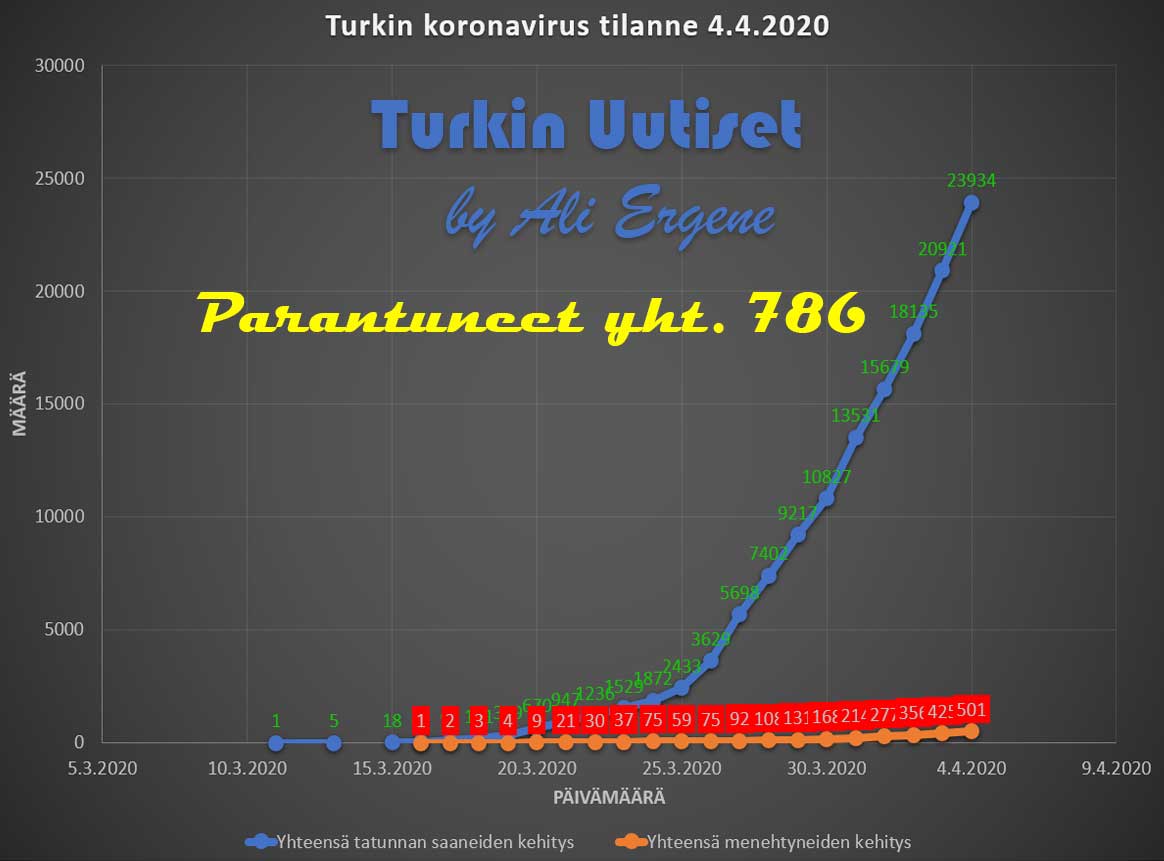 Turkin terveysministeriön mukaan Turkin koronavirus potilaiden määrä on noussut yhteensä 23934. Tänään on todettu lisää 3013 tapausta ja 76 henkilöä on menehtynyt. Yhteensä menehtyneiden määrä on 501. Yhteensä 786 potilasta on kotiutunut sairaaloista toipumisen jälkeen tappavasta viruksesta. Tänään on tehty 19664 testiä.