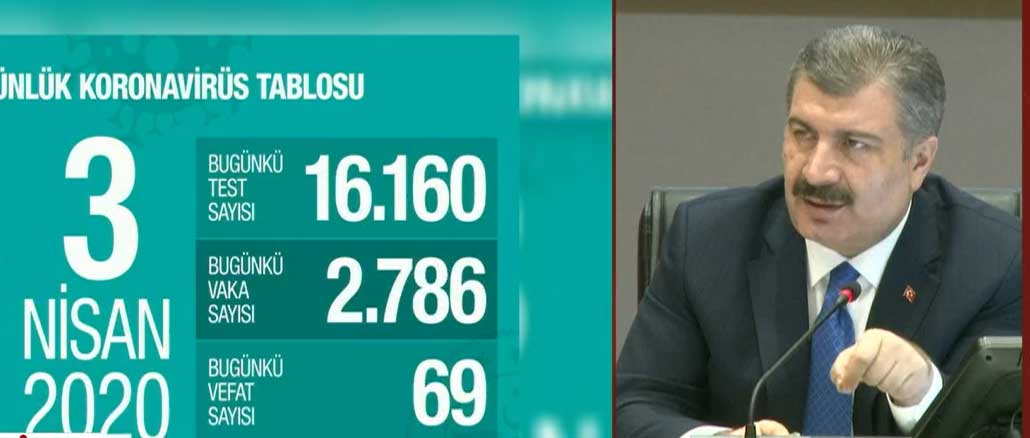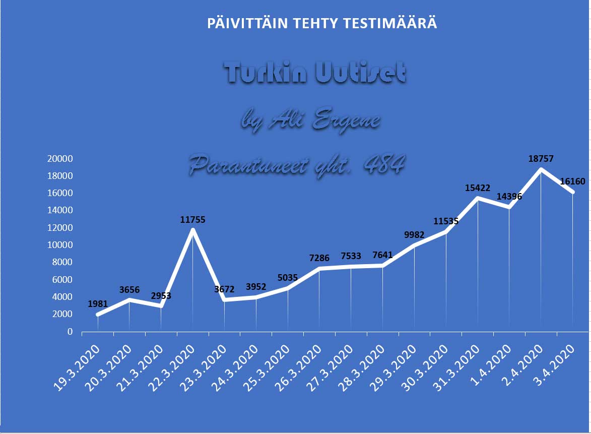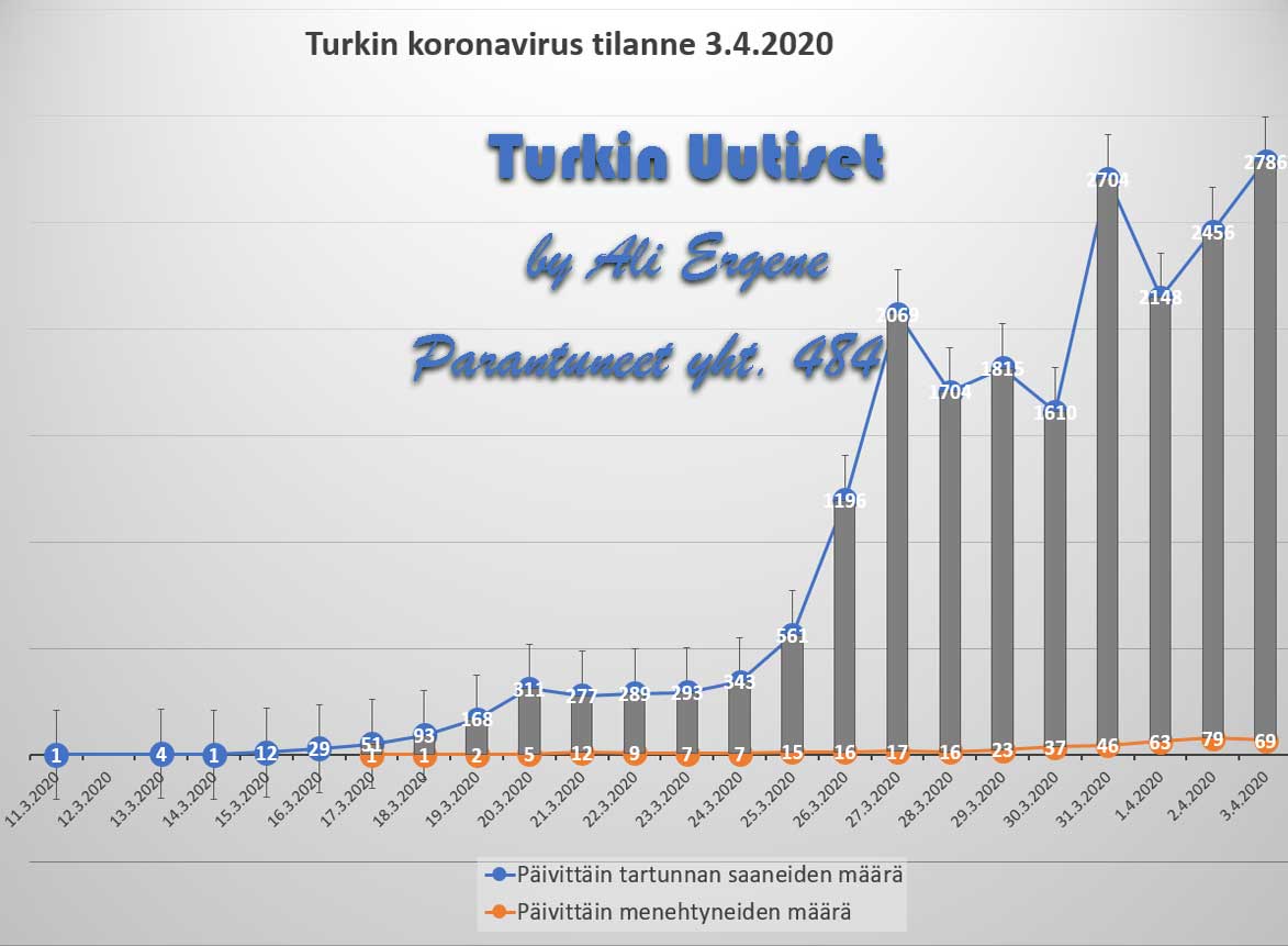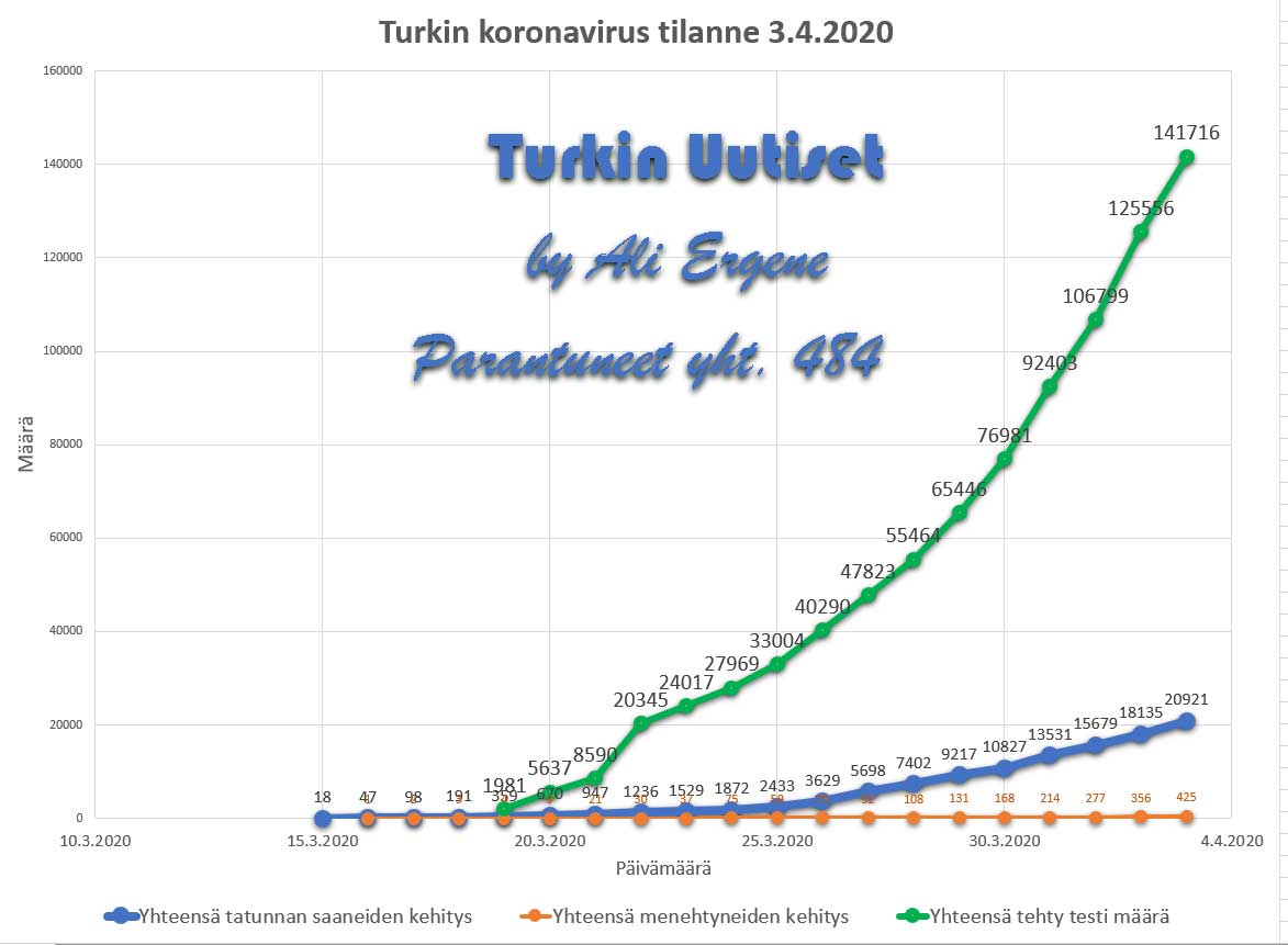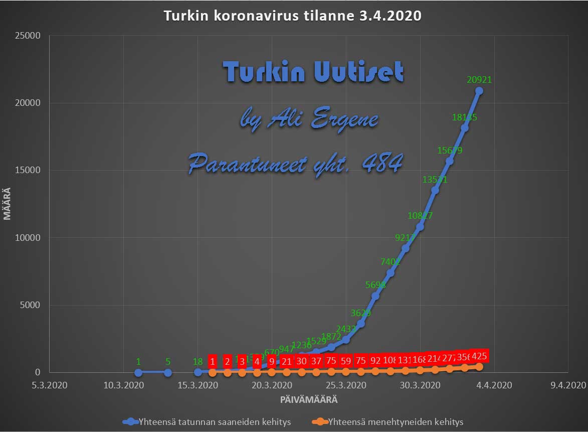 Turkin terveysministeri Fahrettin Koca:n mukaan Turkin koronavirus potilaiden määrä on noussut yhteensä 16160. Tänään on todettu lisää 2786 tapausta ja 69 henkilöä on menehtynyt. Yhteensä menehtyneiden määrä on 425. Yhteensä 484 potilasta on kotiutunut sairaaloista toipumisen jälkeen tappavasta viruksesta.
