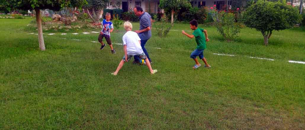Lapset pelaavat jalkapalloa nurmikolla. Kuva: Ali Ergene