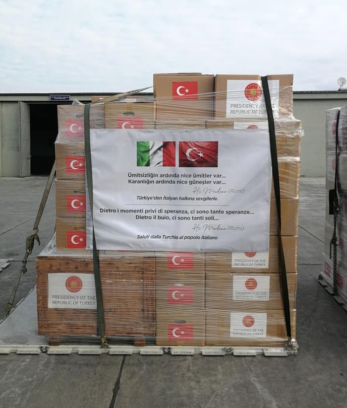 Naton pääsihteeri Jens Stoltenberg kertoi, että Turkin asevoimat (TSK) lähettivät terveystarvikkeita Italiaan ja Espanjaan, mikä on selkeä osoitus liittolaisten solidaarisuudesta. Stoltenberg jakoi kuvan Twitterissä ja sanoi olevansa ylpeä Turkin solidaarisuudesta.
