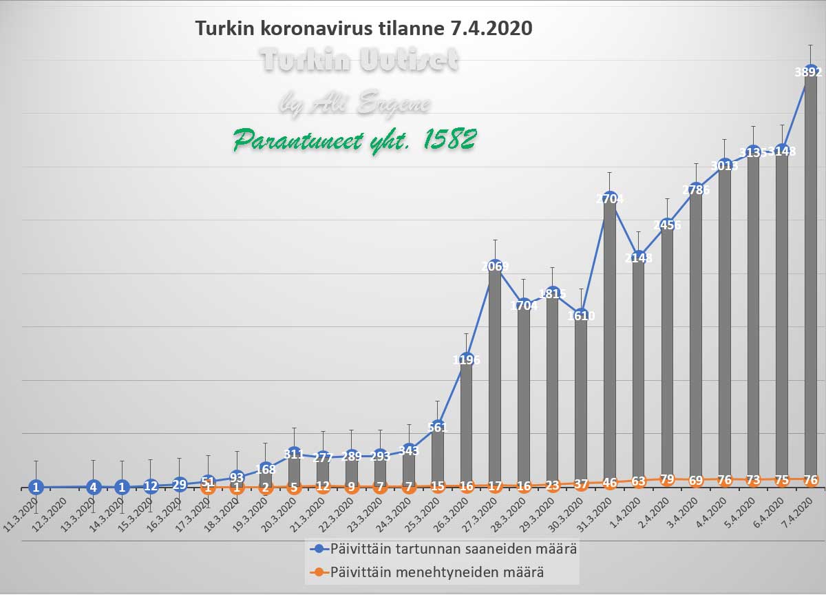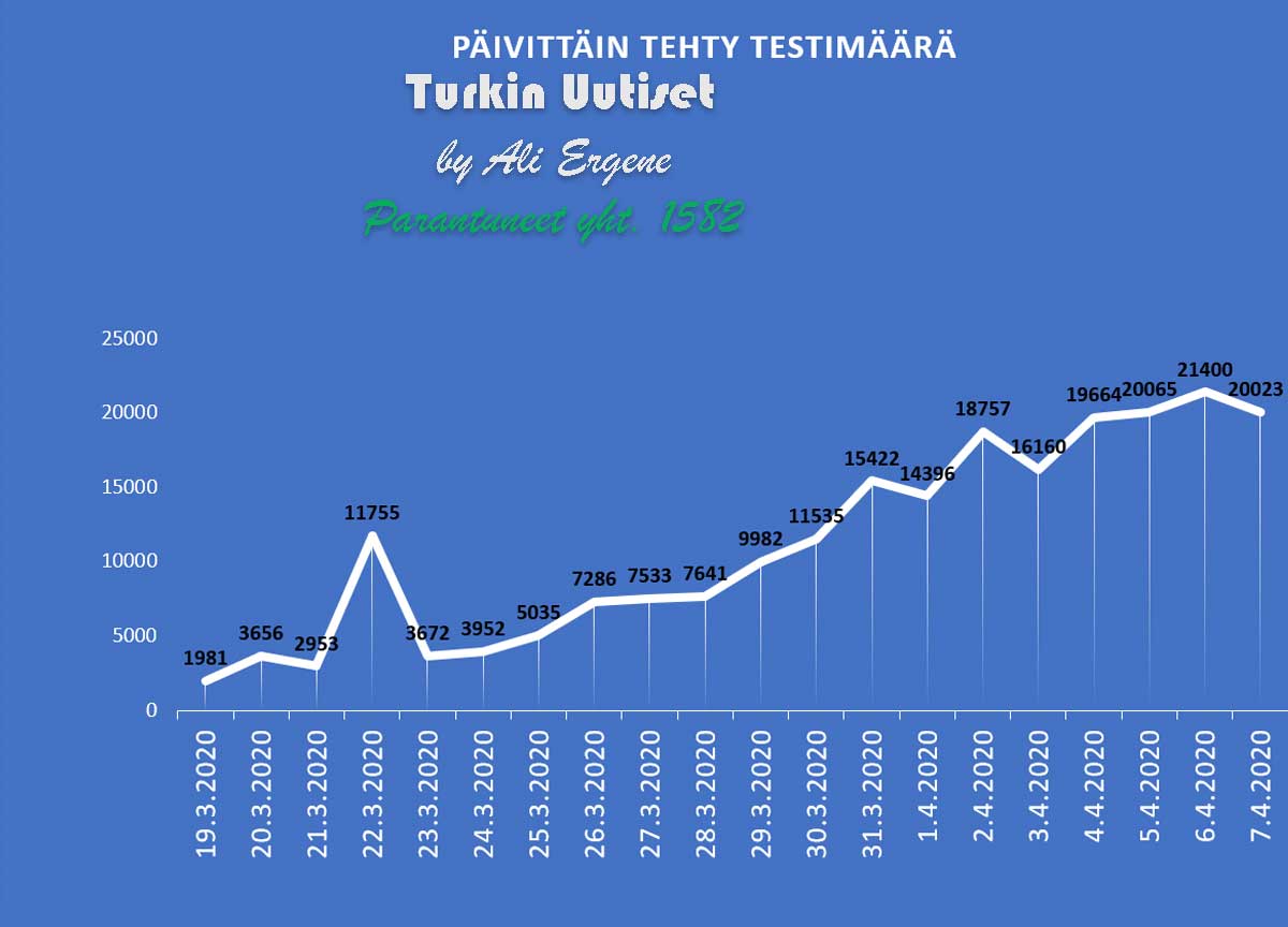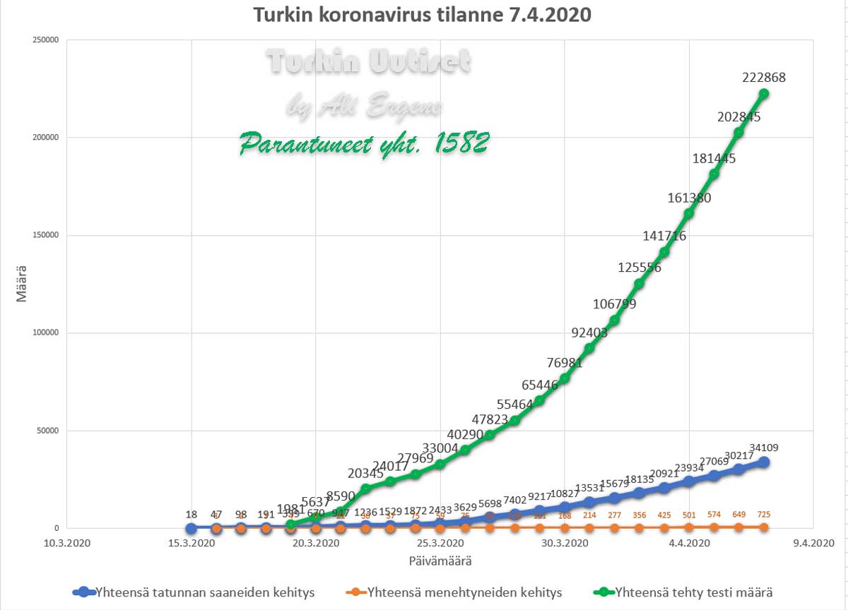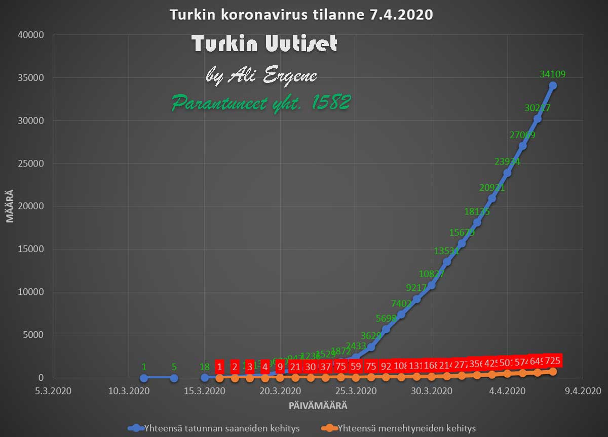 Turkin terveysministeriön mukaan Turkin koronavirus potilaiden määrä on noussut yhteensä 34109. Tänään on todettu lisää 3892 tapausta ja 76 henkilöä on menehtynyt. Yhteensä menehtyneiden määrä on 725. Yhteensä 1582 potilasta on kotiutunut sairaaloista toipumisen jälkeen tappavasta viruksesta. Tänään on tehty 20023 testiä. Turkin terveysministeri kertoi että Turkkiin on perustettu tiede -ja yhteiskunta lautakunta.