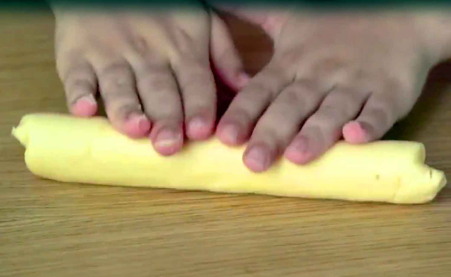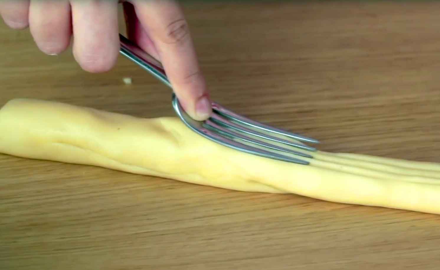 - Leikkaa rullan päät tasaisiksi. Painele ja piirrä kevyesti kuvio rullaan haarukan avulla jolloin muoto muuttuu levymäiseksi.