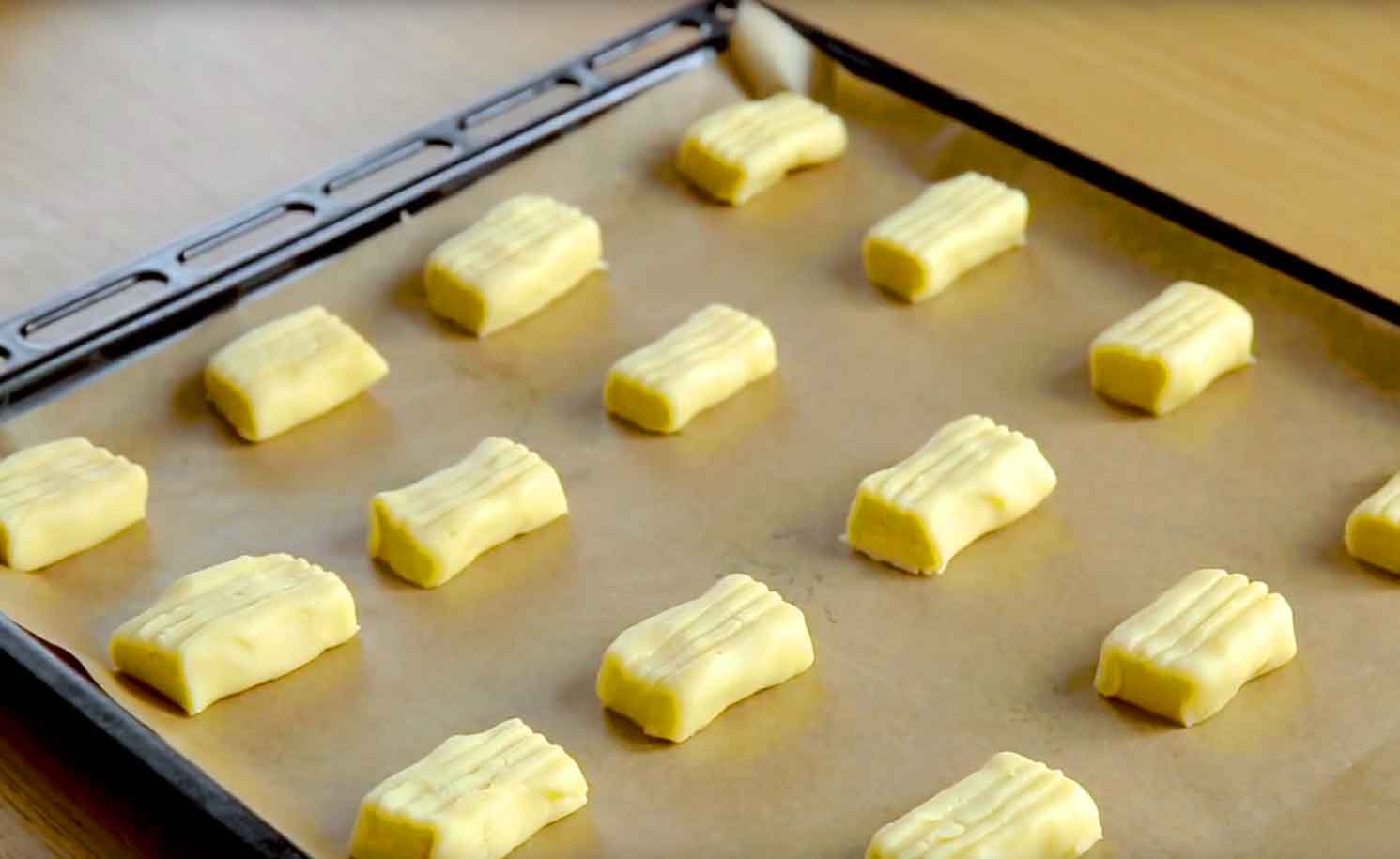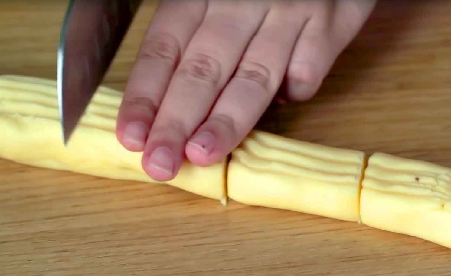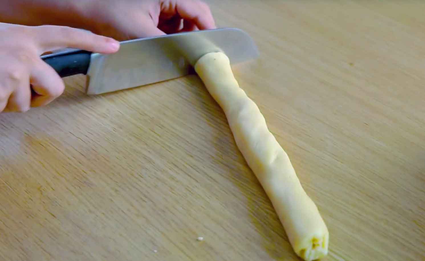 - Leikkaa 3 sormea leveä pala veitsen avulla. Siirrä leivinpellille.