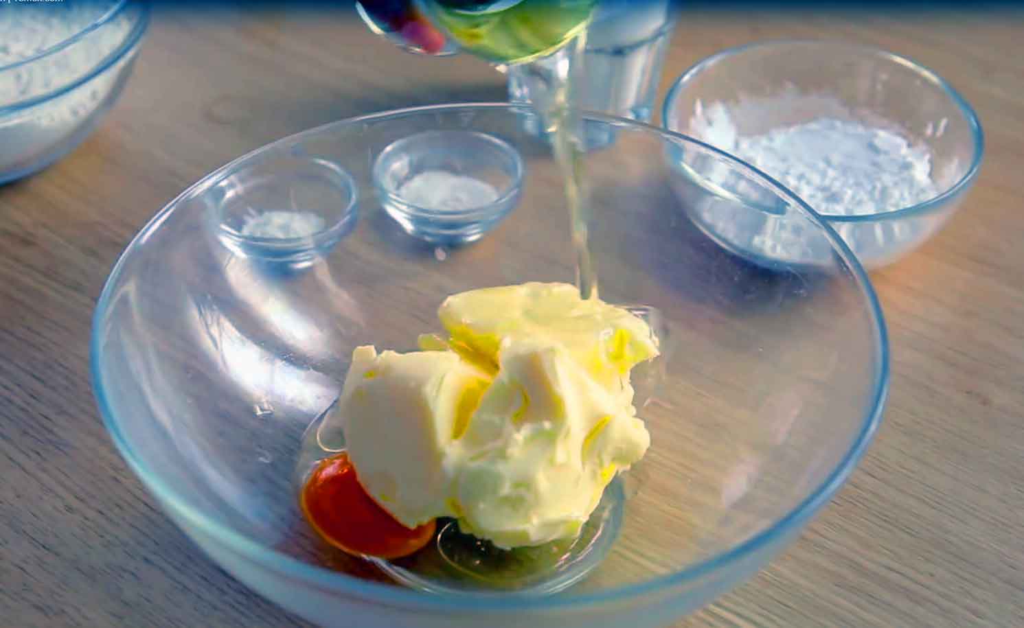 - Lisää vähitellen jauhettua sokeria, vehnätärkkelystä, leivinjauhetta, vaniljaa ja vehnäjauhoja.