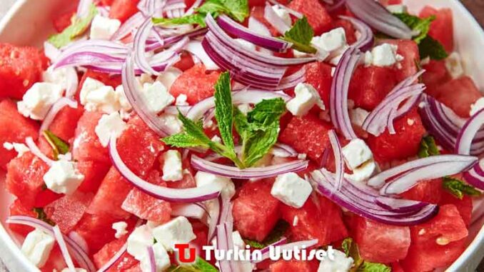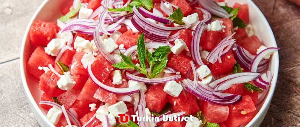 Lisää minttua ja punasipulia: Mehukkaan, makean melonin ja rapean, terävän, pippurisen sipulin välinen kontrasti – murenevasta, kermaisesta fetasta puhumattakaan – on mahtava. Tuore minttu yhdistää kaiken kesän autuuteen. Minttu hapettuu ja tummuu nopeasti leikkaamisen tai revimisen jälkeen, joten lisää se juuri ennen salaatin kokoamista ja tarjoilua.